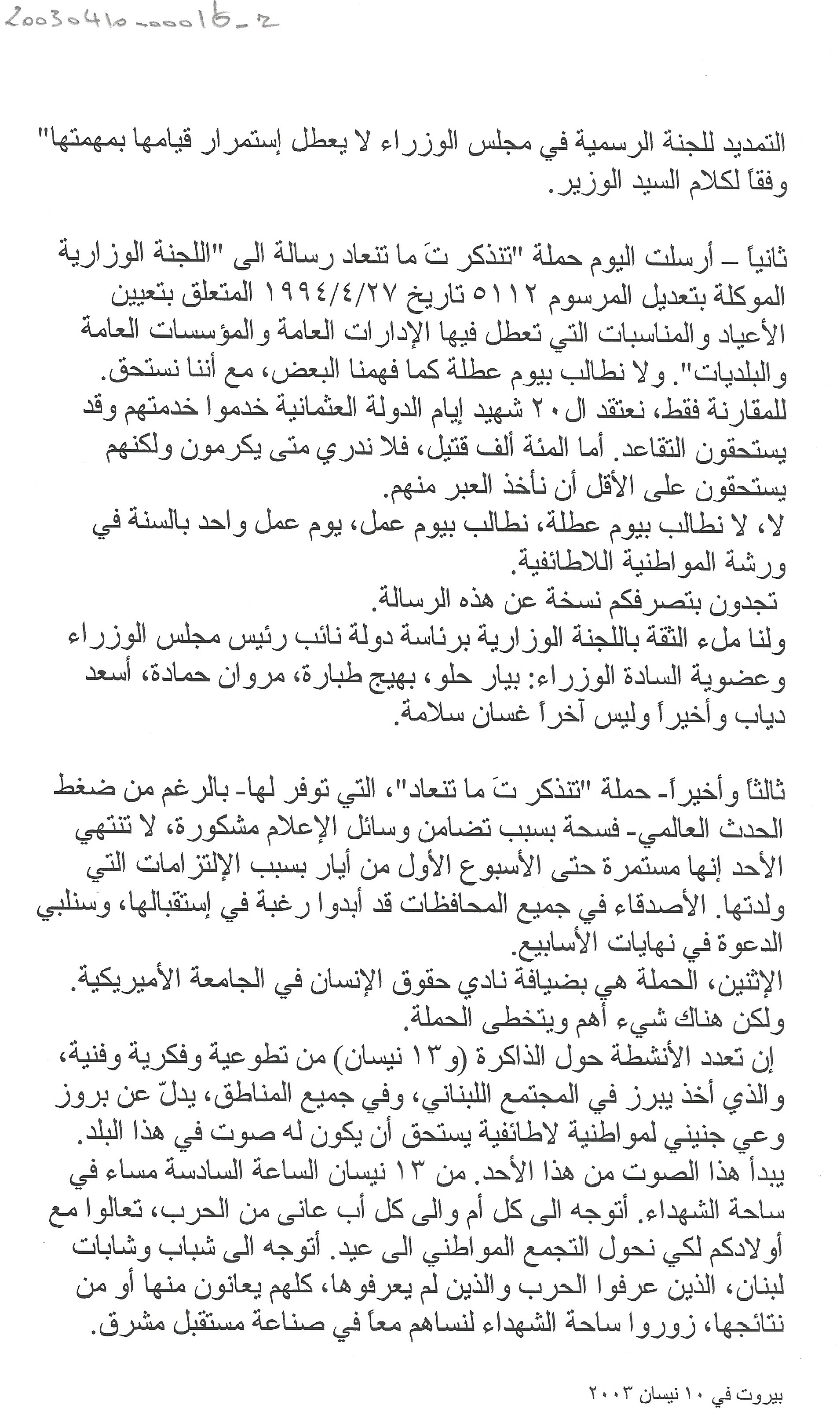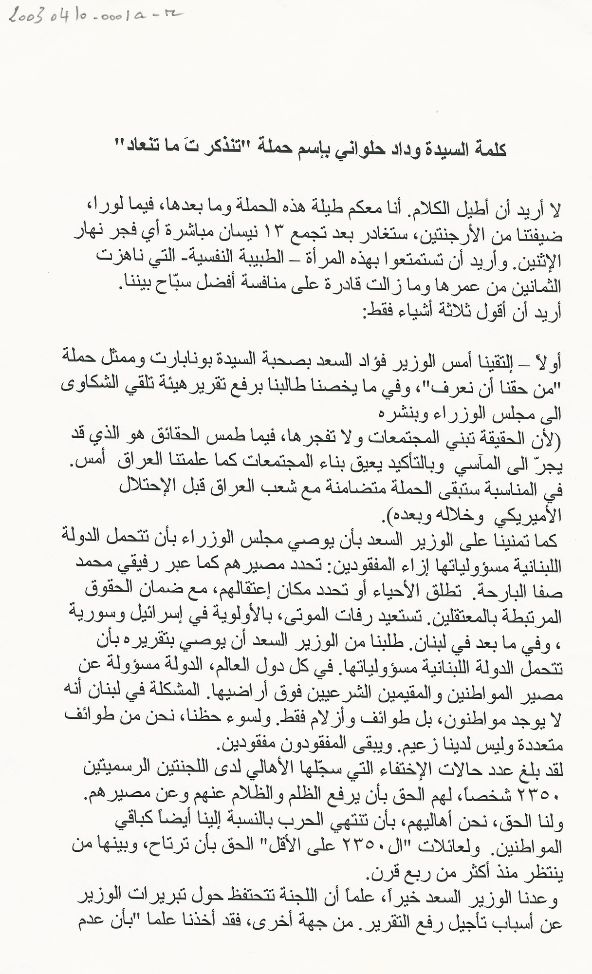 - en The speech of Mrs. Wadad Halawani in the name of the “May it be remembered and so not repeated” campaign.