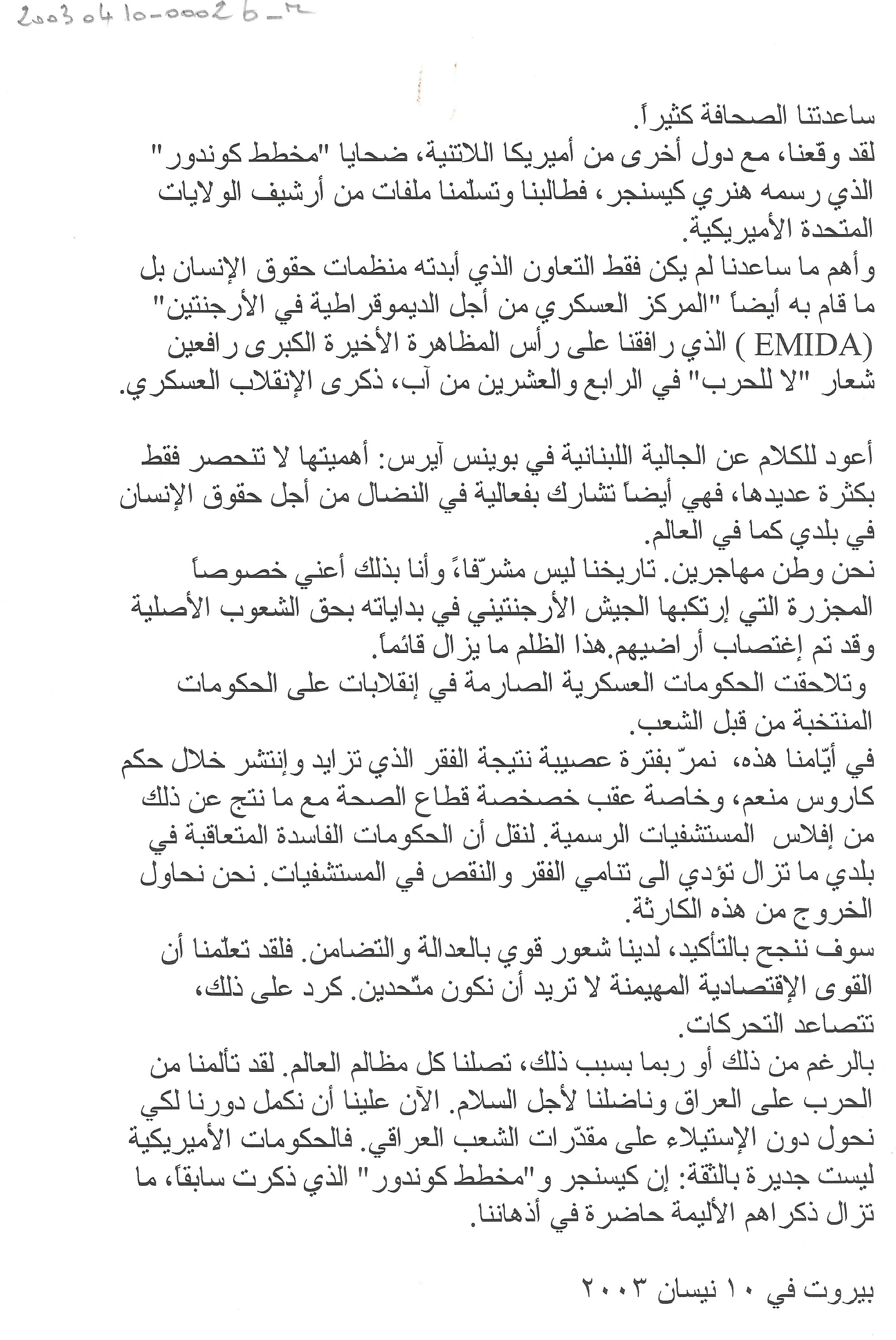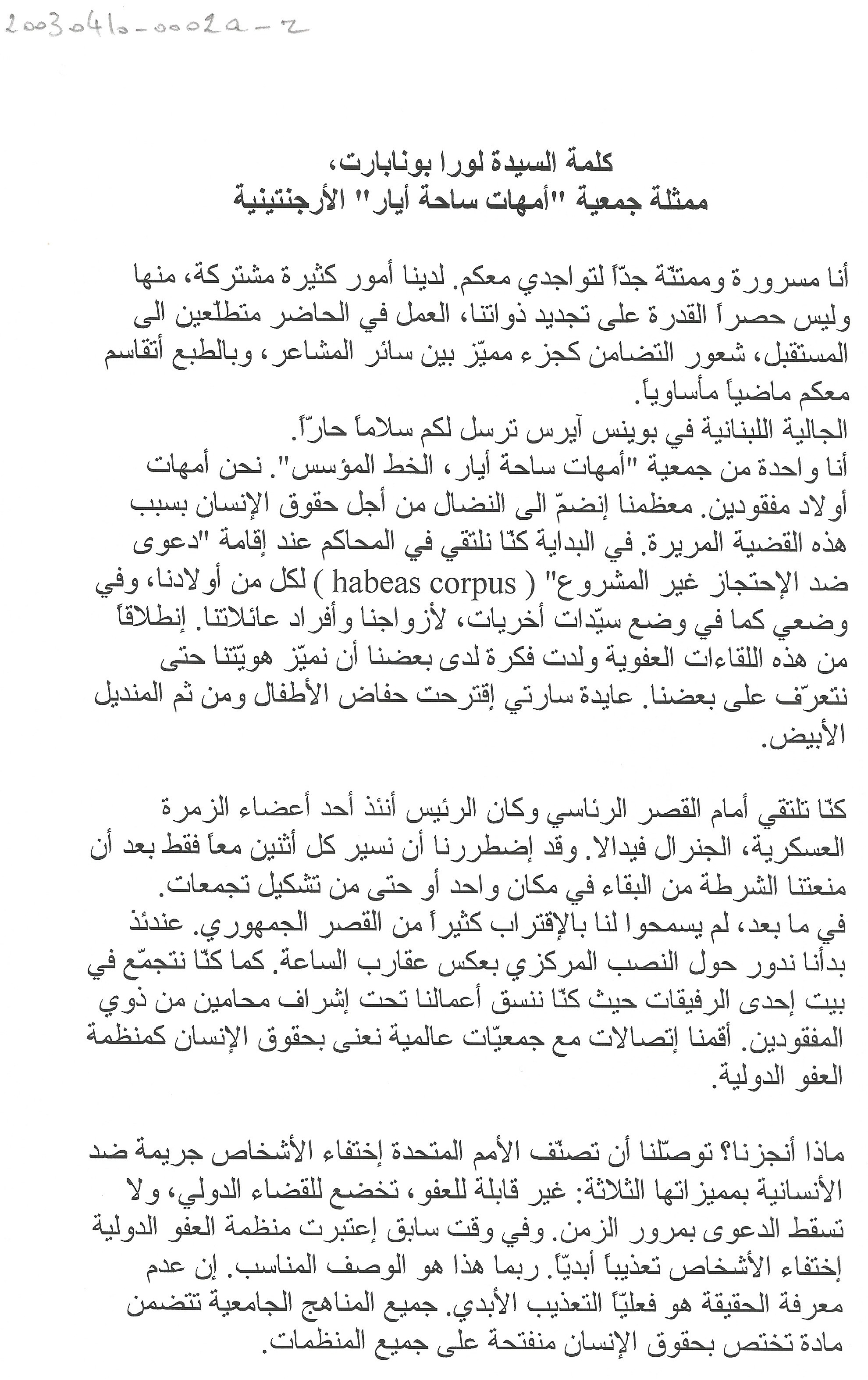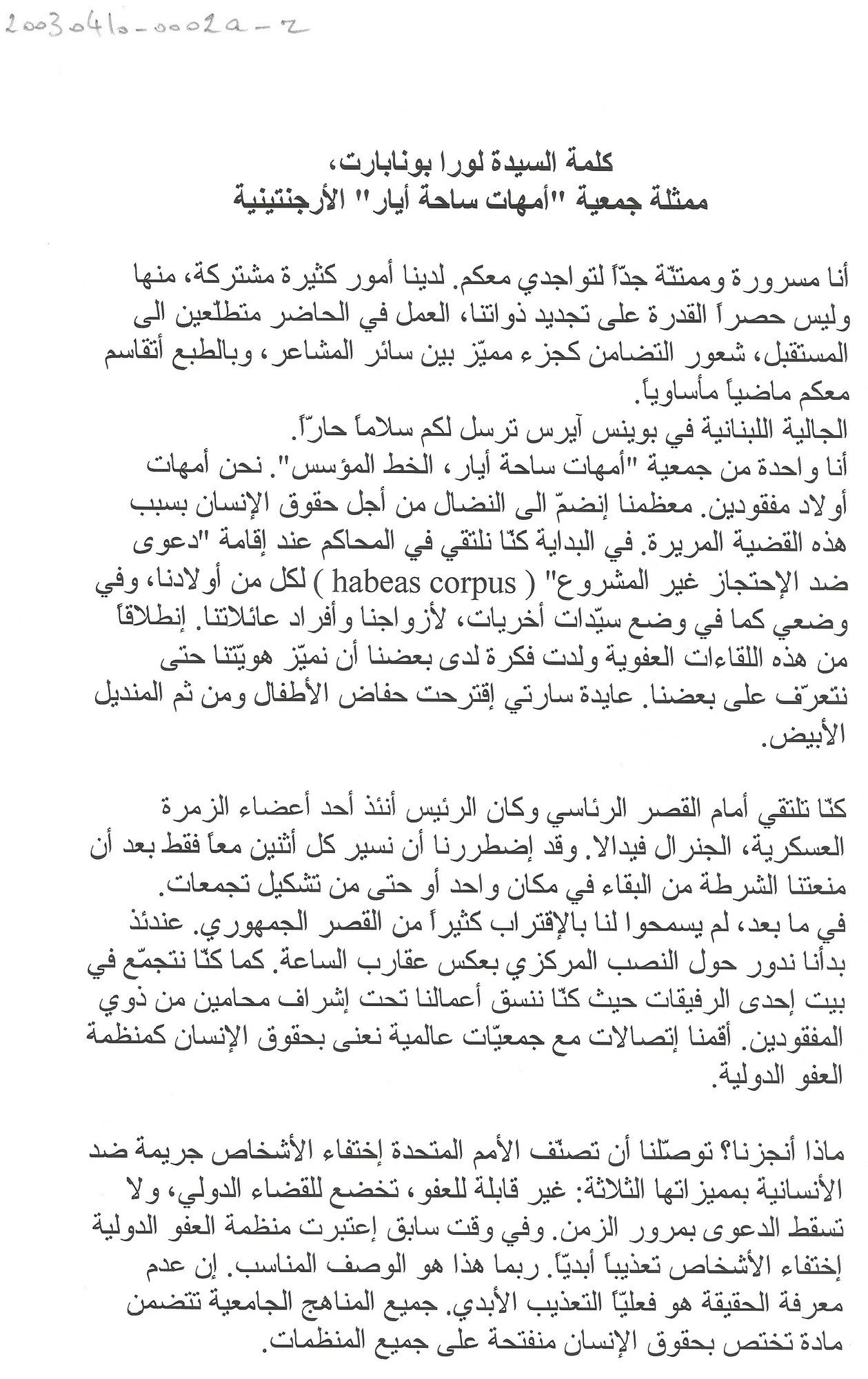 كلمة السيدة لورا بونابارت، ممثلة جمعية امهات ساحة ايار الارجنتينية