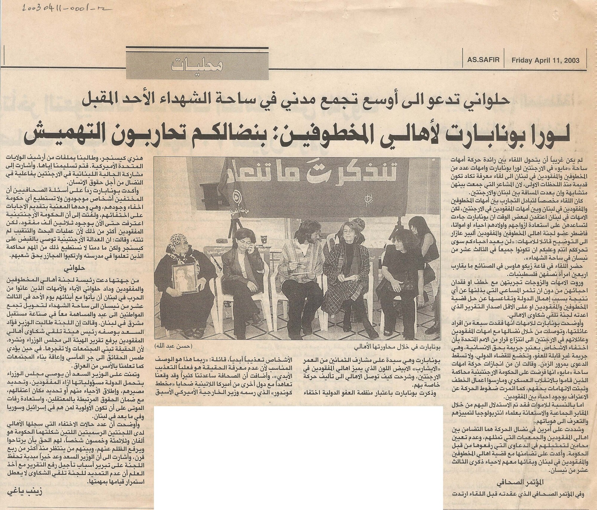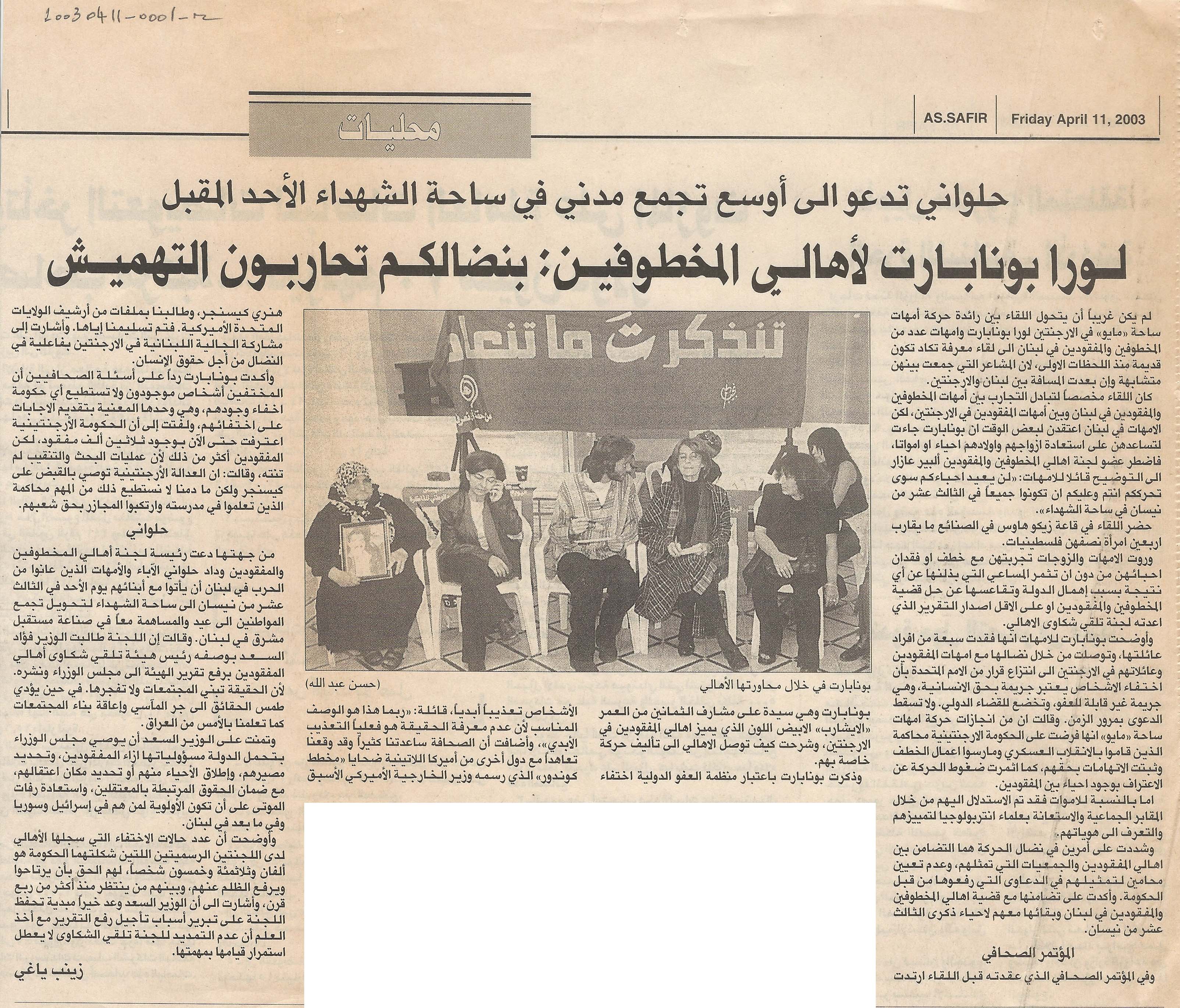 حلواني تدعو الى اوسع تجمع مدني في ساحة الشهداء الاحد المقبل لورا بونابارت لاهالي المخطوفين: بنضالكم تحاربون التهميش