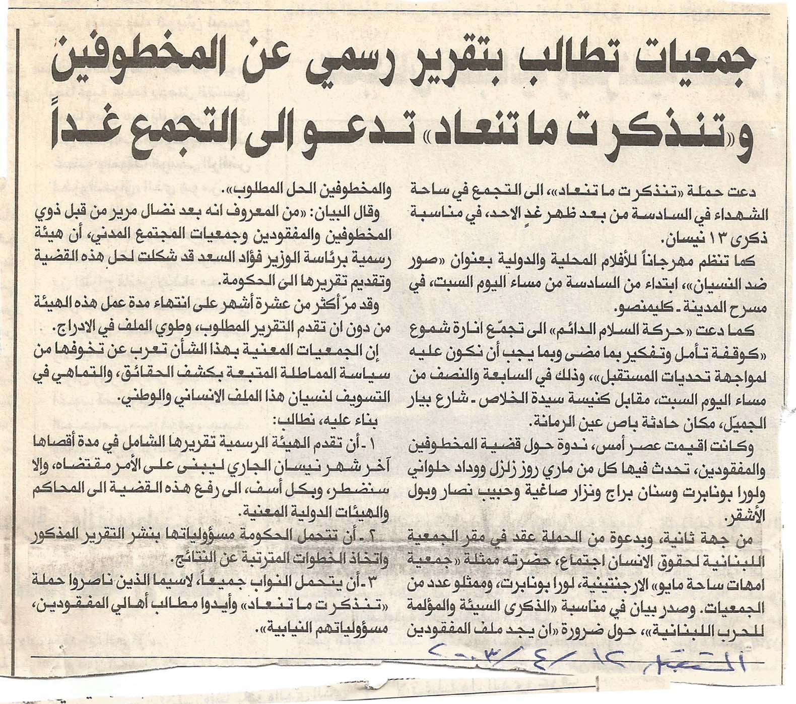 - ar جمعيات تطالب بتقرير رسمي عن المخطوفين وتنذكر ت ما تنعاد تدعو الى التجمع غدا