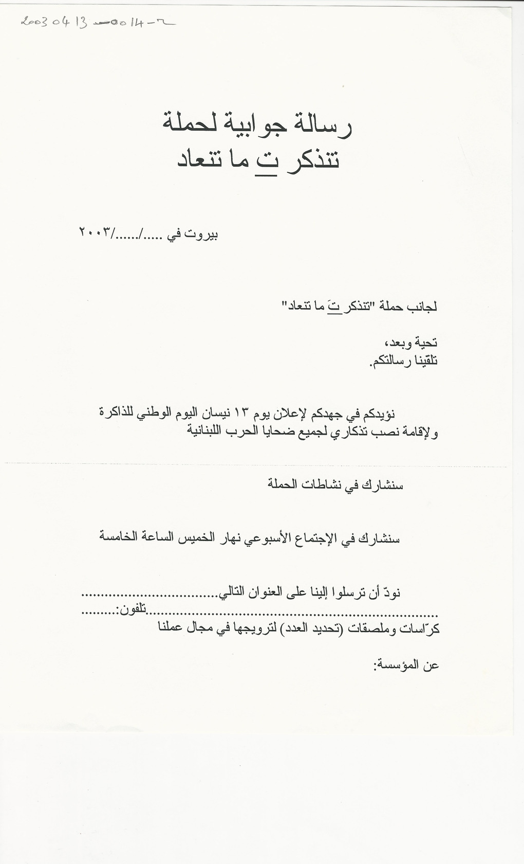 - ar رسالة جوابية لحملة تنذكر ت ما تنعاد
