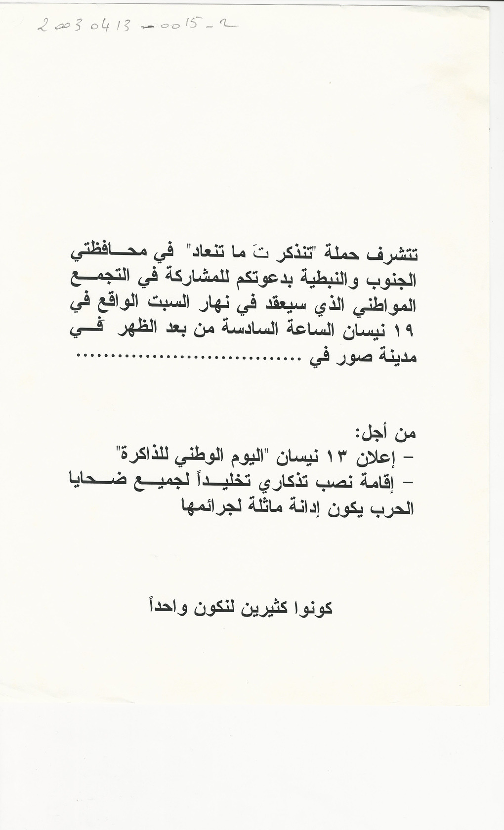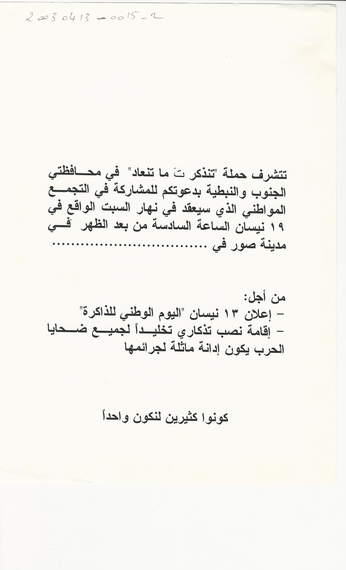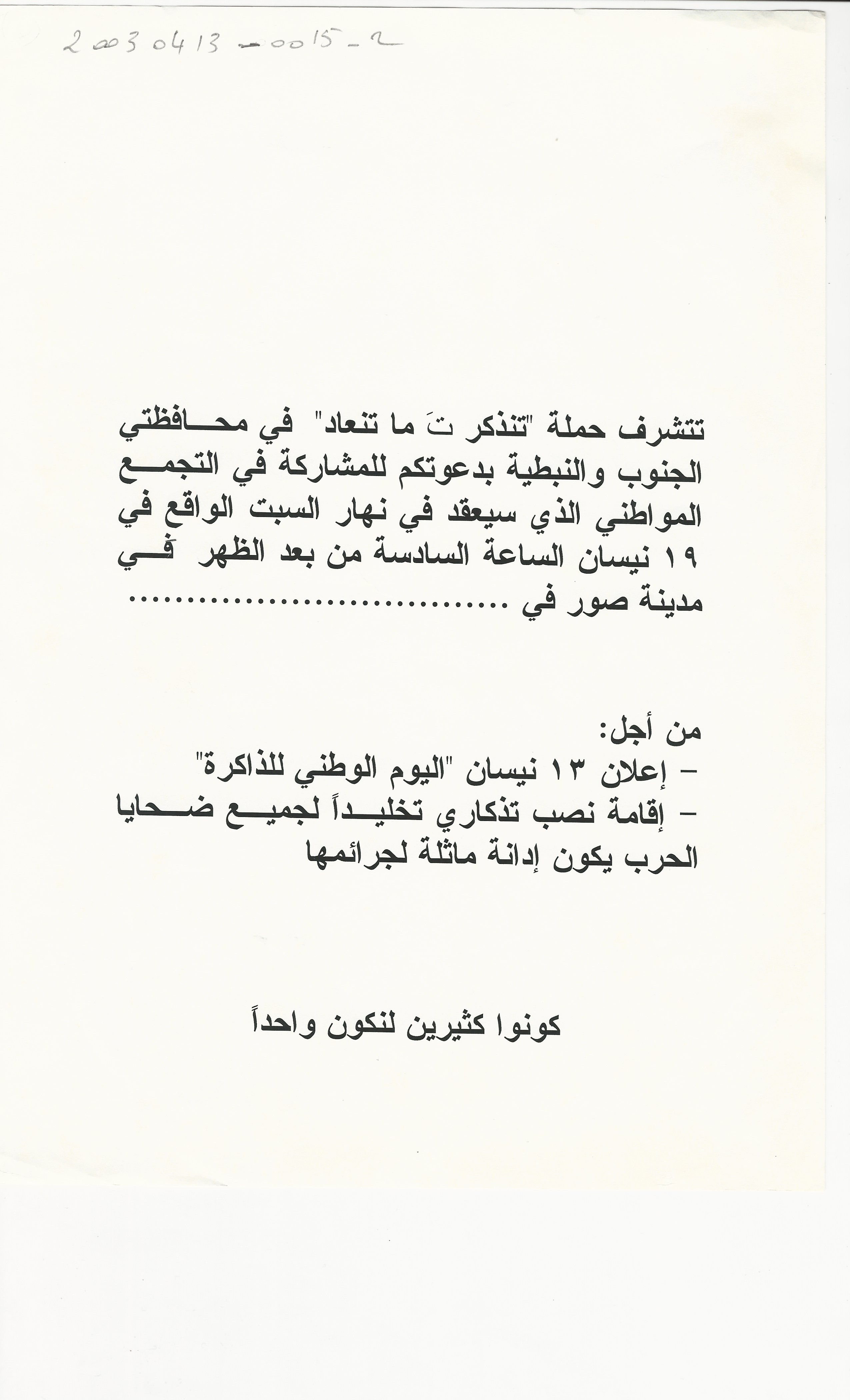 - ar دعوة حملة تنذكر ت ما تنعاد للقاء في صور