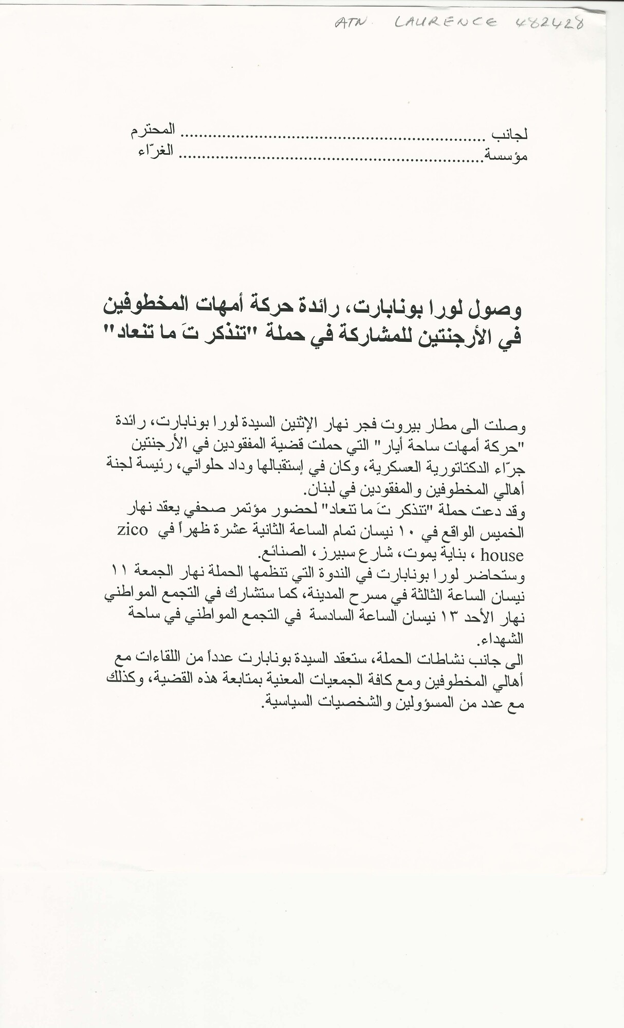 وصول لورا بونابارت رائدة حركة امهات المخطوفين في الارجنتين للمشاركة في حملة تنذكر ت ما تنعاد