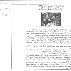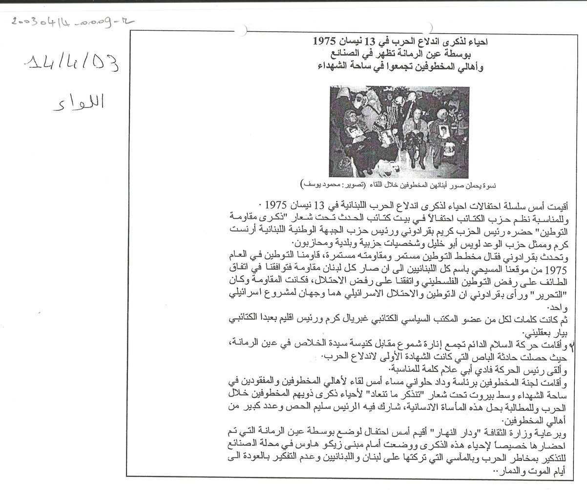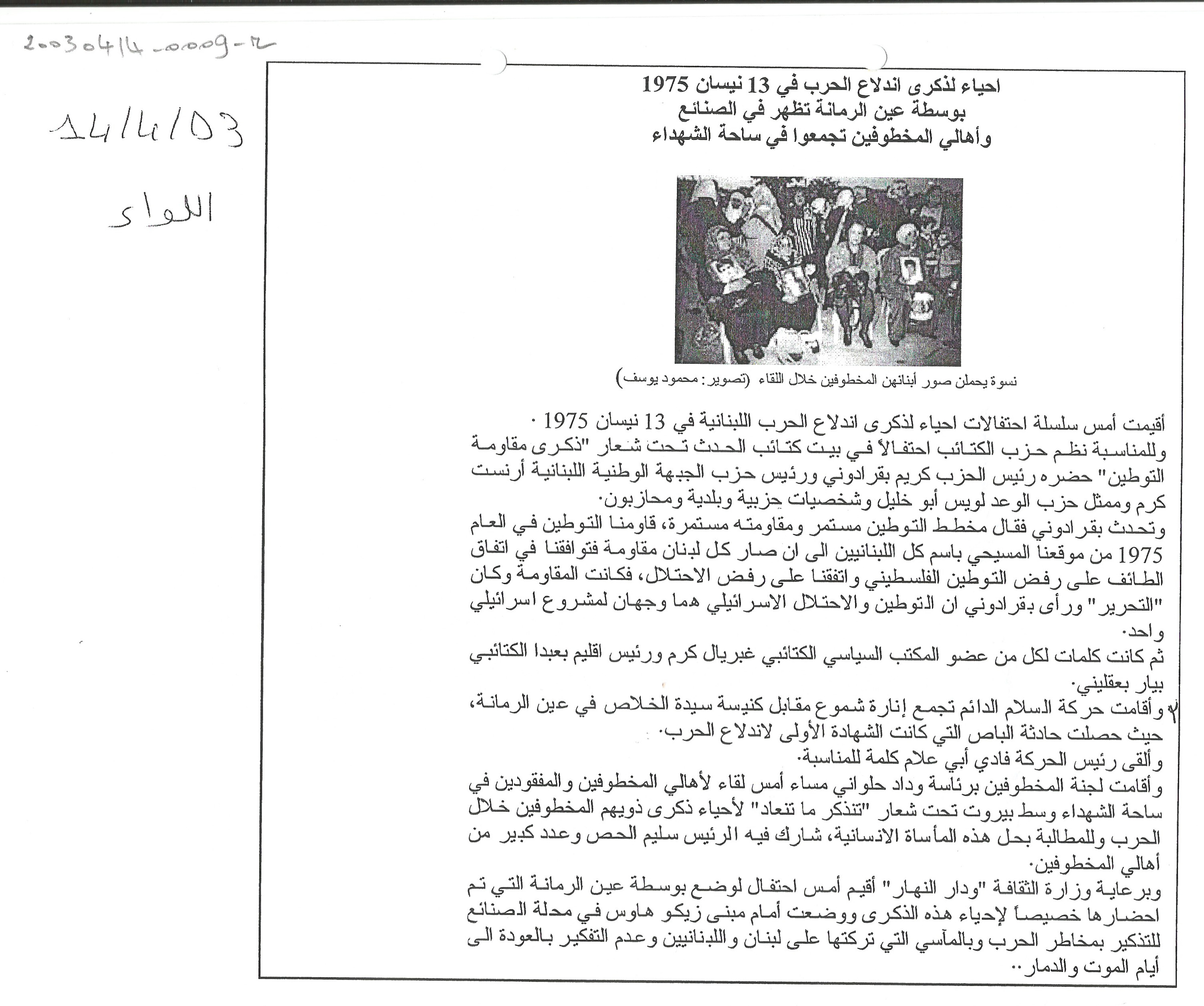 In commemoration of the anniversary of the outbreak of the war on April 13, 1975, Ayn el-Remmaneh’s Bus appears in the Sanayeh Garden and the families of the kidnapped gather in Martyrs’ Square.