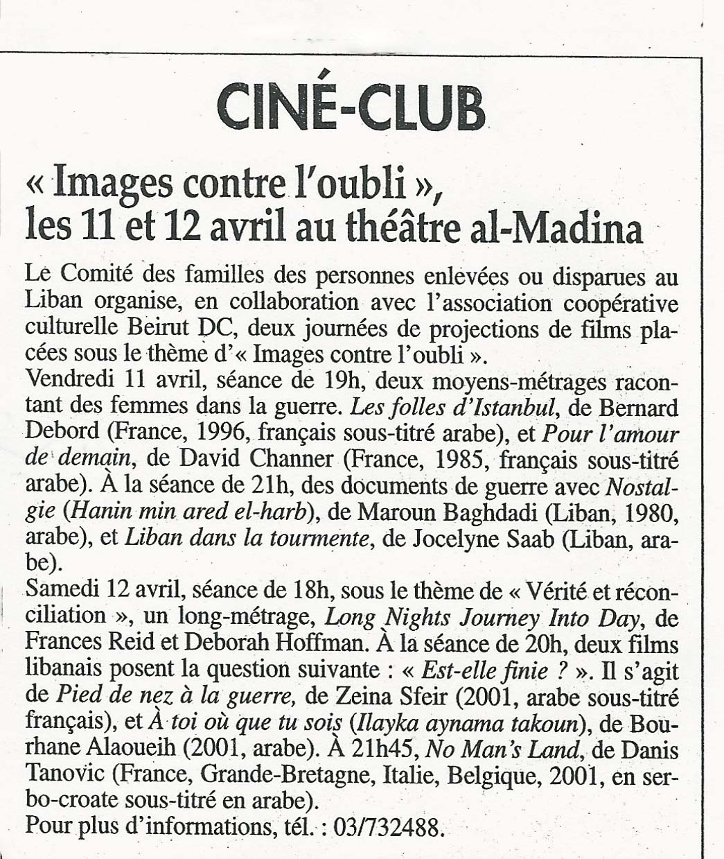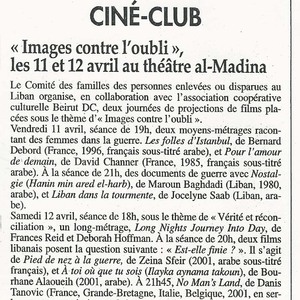 - fr CINÉ-CLUB Images contre l'oubli: les 11 et 12 Avril au theatre al Madina