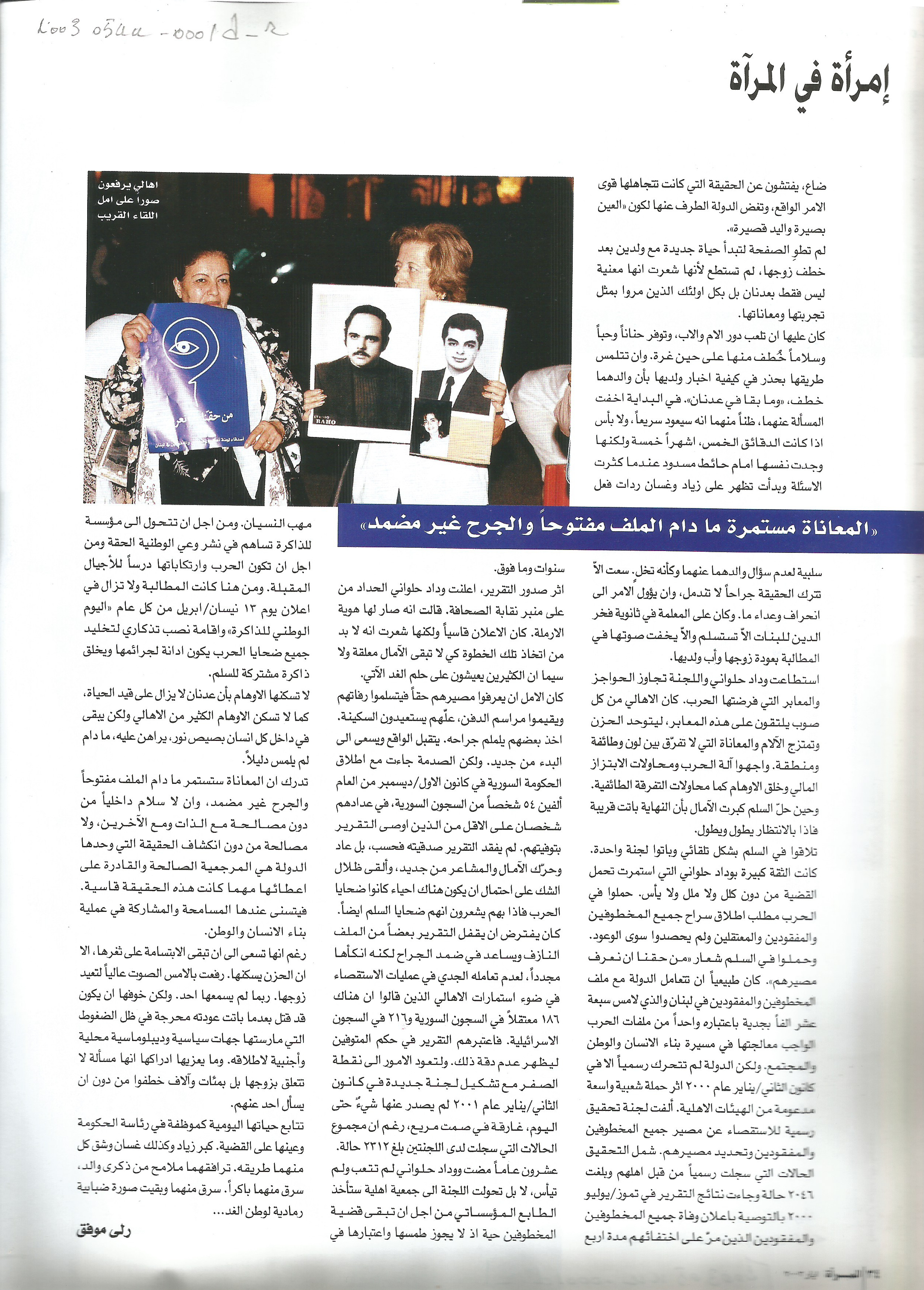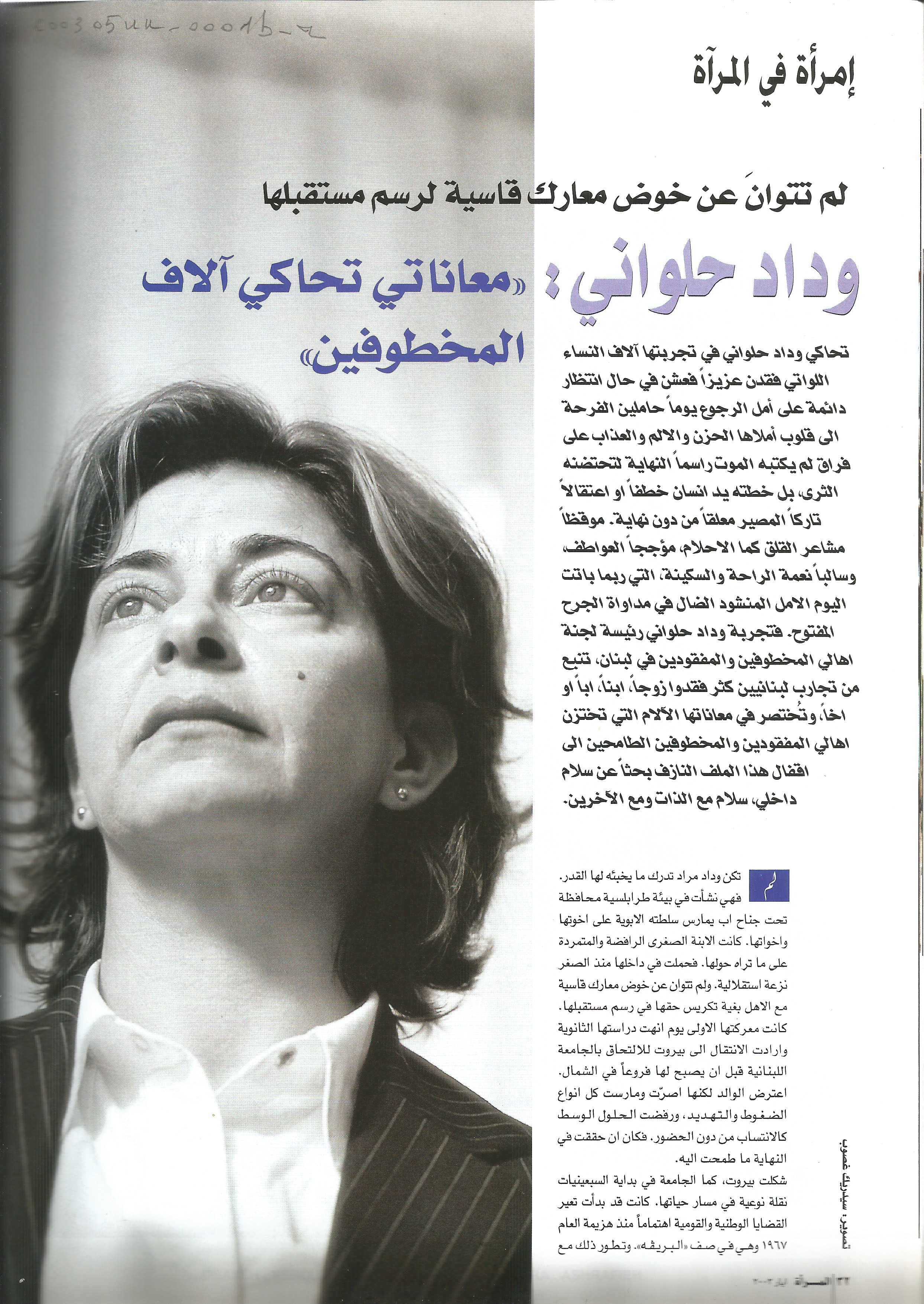 - en She did not refrain from fighting the fierce battle to paint her future differently. Wadad Halawani: My suffering speaks of hundreds of kidnapped.