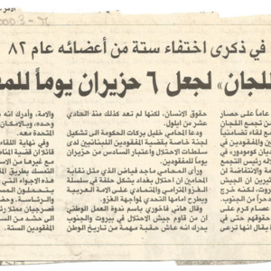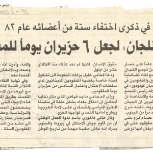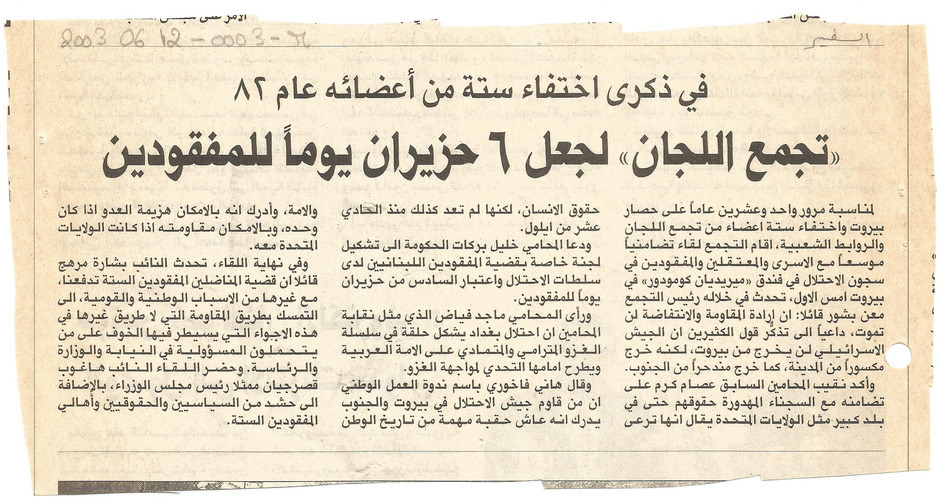 - ar تجمع اللجان لجعل 6 حزيران يوما للمفقودين، في ذكرى اختفاء ستة من اعضائه عام 82