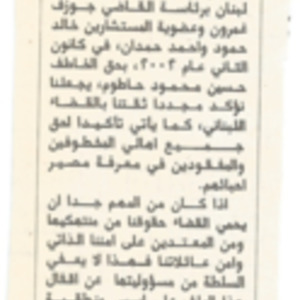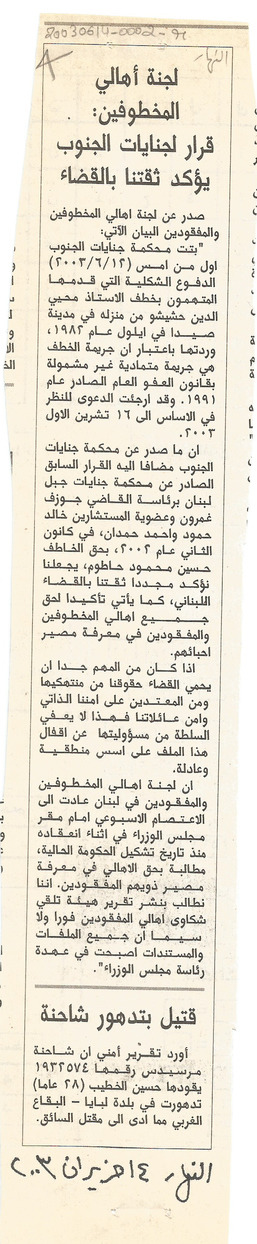 - ar لجنة اهالي المخطوفين: قرار لجنايات الجنوب يؤكد ثقتنا بالقضاء