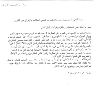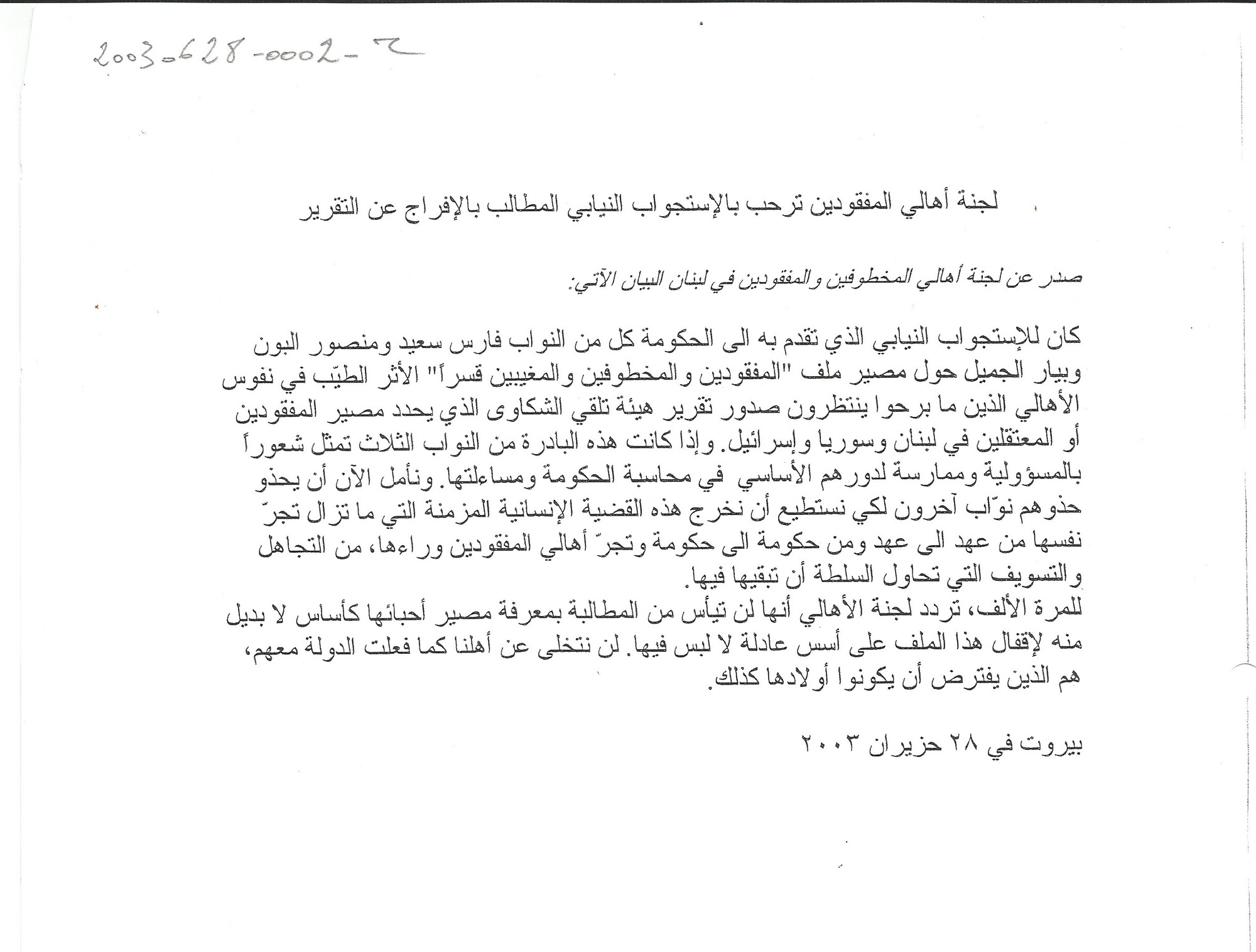 لجنة اهالي المفقودين ترحب بالاستجواب النيابي المطالب بالافراج عن التقرير