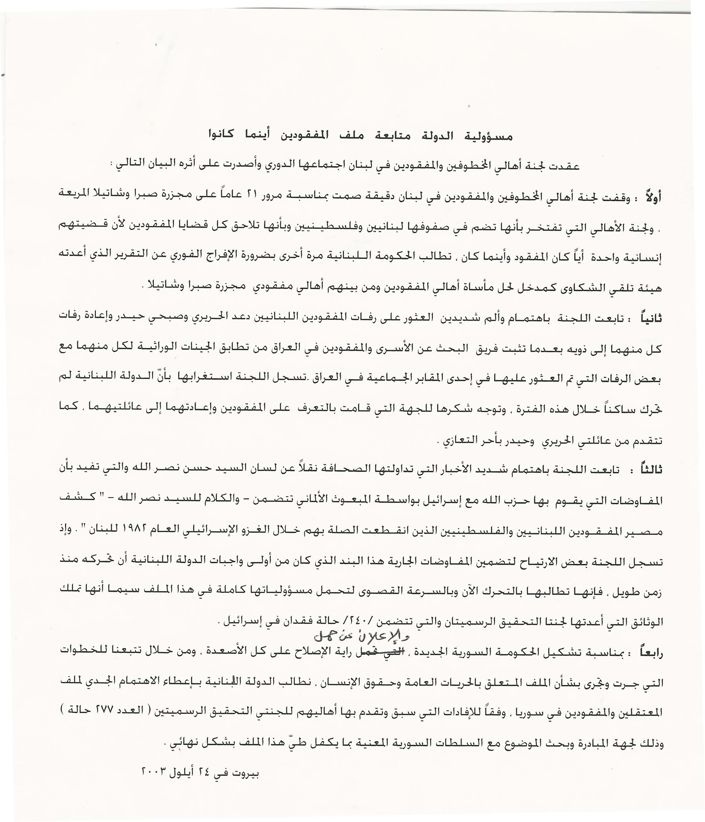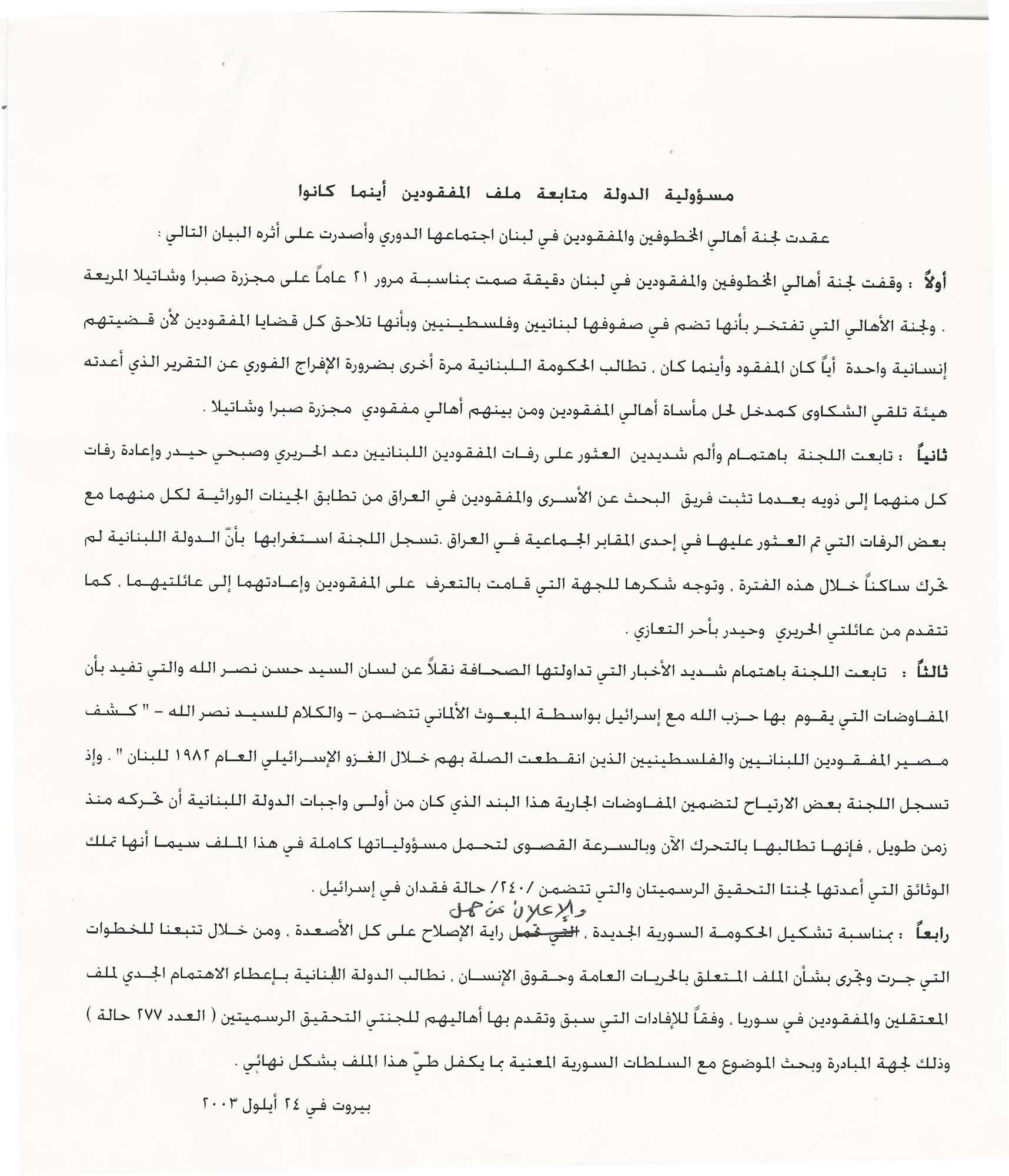 - ar مسؤولية الدولة متابعة ملف المفقودين اينما كانوا