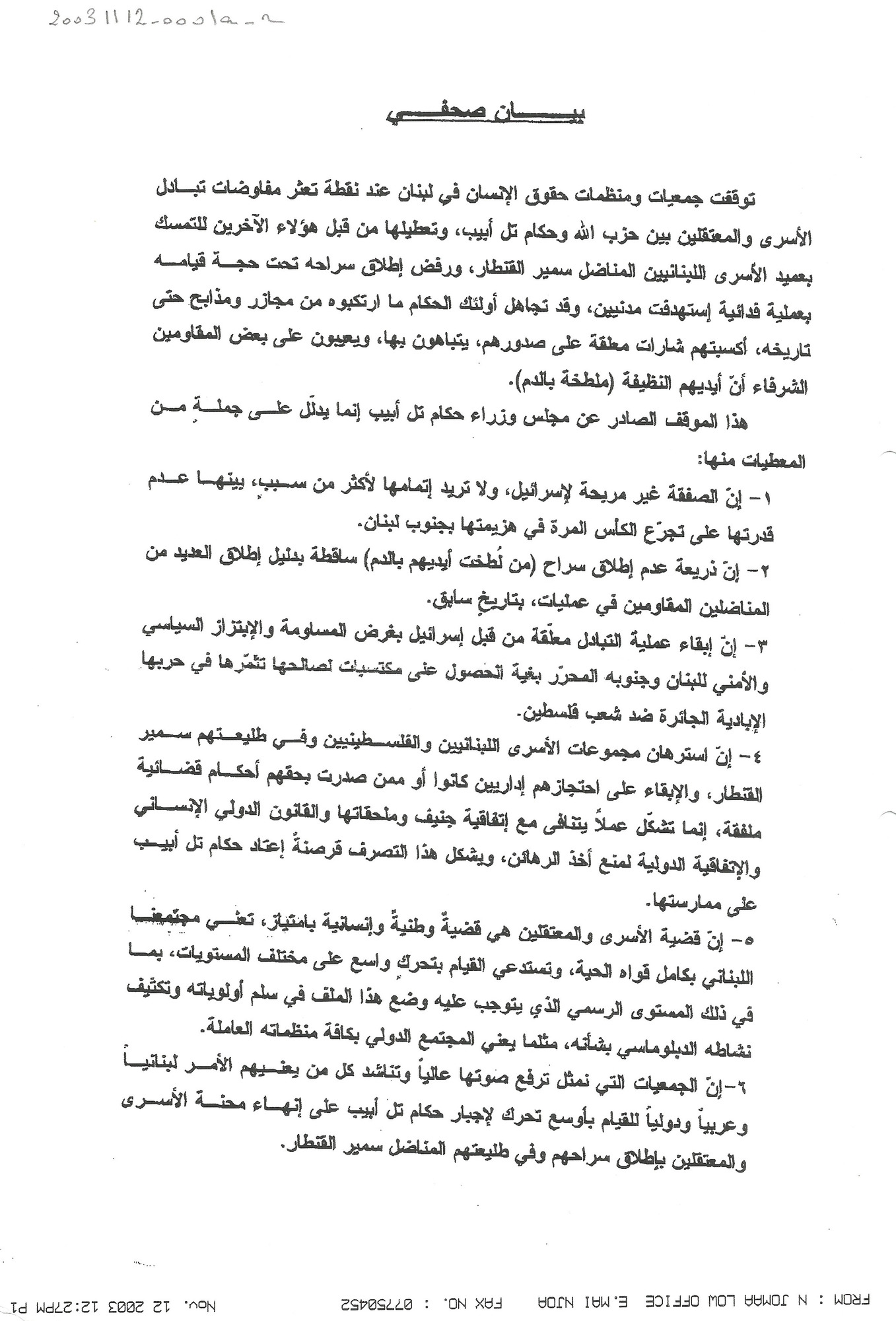 - ar توقيع لجنة الاهالي بيان يتعلق بالاسرى والمعتقلين في السجون الاسرائيلية