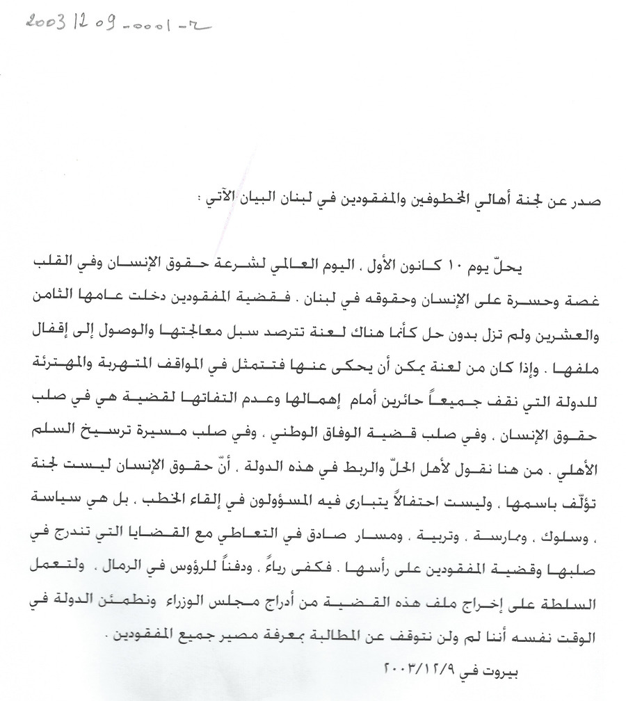 - ar بيان لجنة اهالي المخطوفين والمفقودين في لبنان في يوم حقوق الانسان
