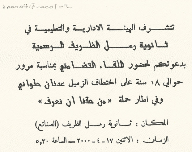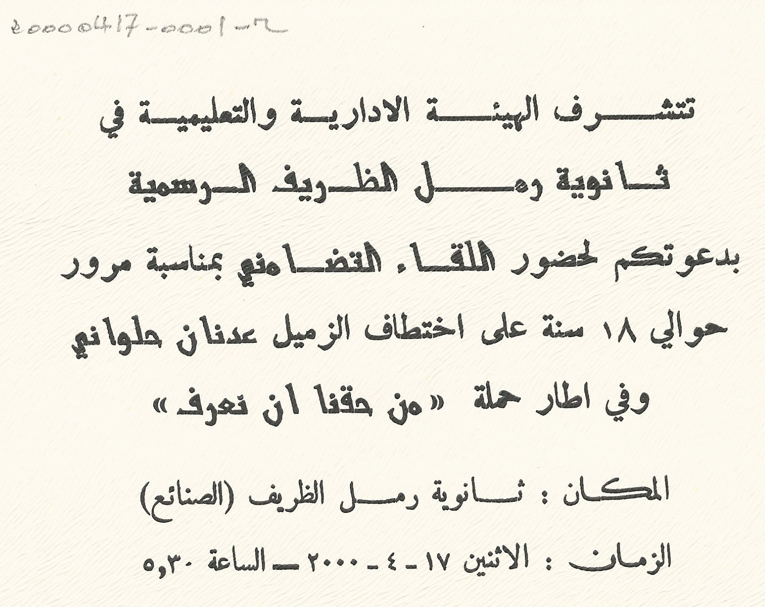 - ar دعوة ثانوية رمل الظريف الى لقاء تضامني بذكرى اختطاف الاستاذ عدنان حلواني