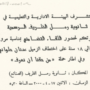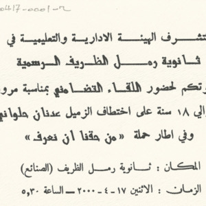 - en The administration and teaching staff at Raml al-Zarif Public High School invite you to attend the solidarity gathering.