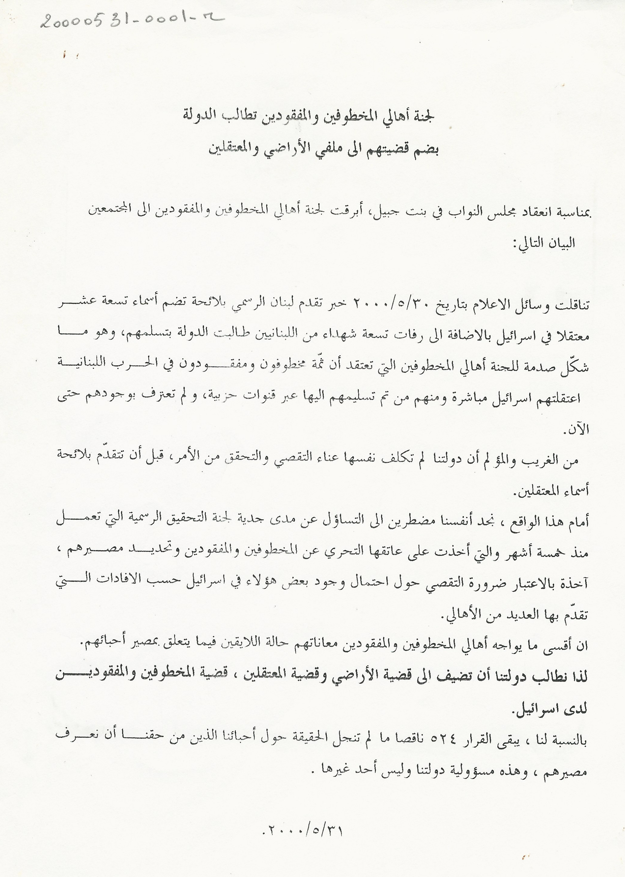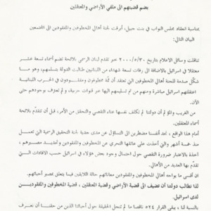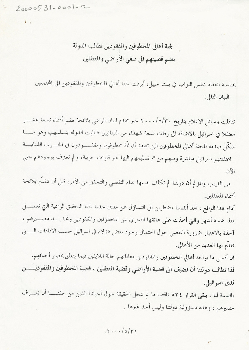 The Committee of the Families of the Kidnapped and Missing calls on authorities to add their issue to the dossiers of territories and detainees.