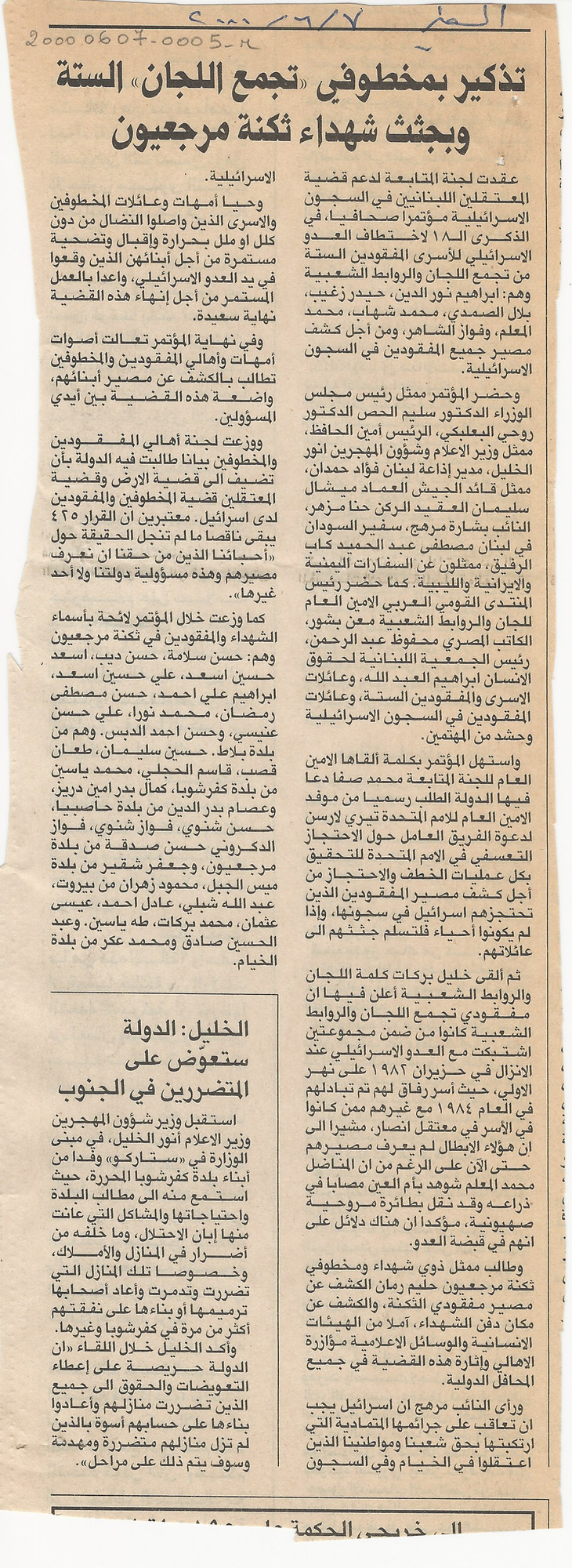 - ar تذكير بمخطوفي تجمع اللجان الستة وبجثث شهداء ثكنة مرجعيون