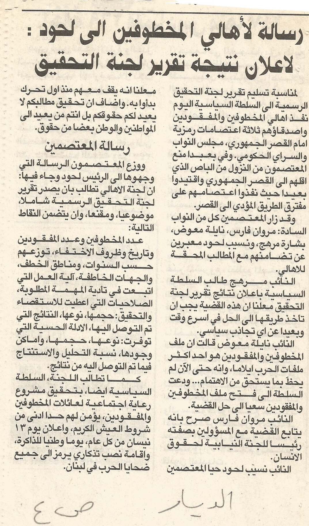 - ar رسالة لاهالي المخطوفين الى لحود: لاعلان نتيجة تقرير لجنة التحقيق