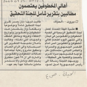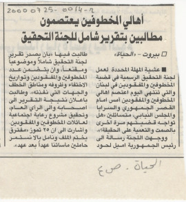 - en The families of the kidnapped hold a sit-in, calling on the commission of inquiry to issue a comprehensive report.