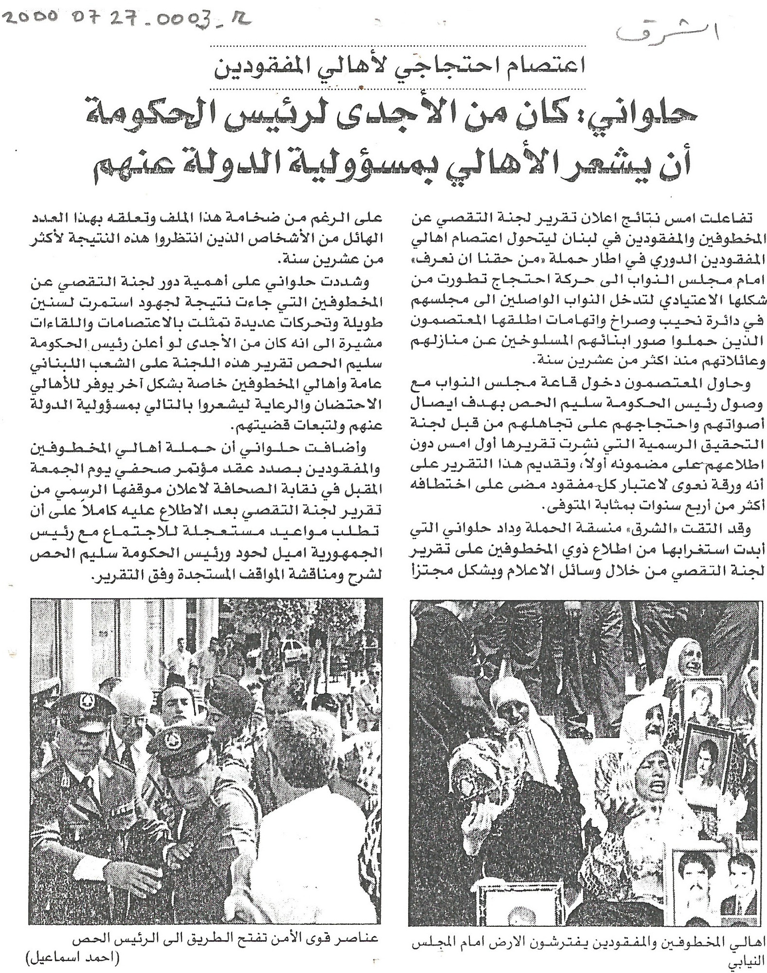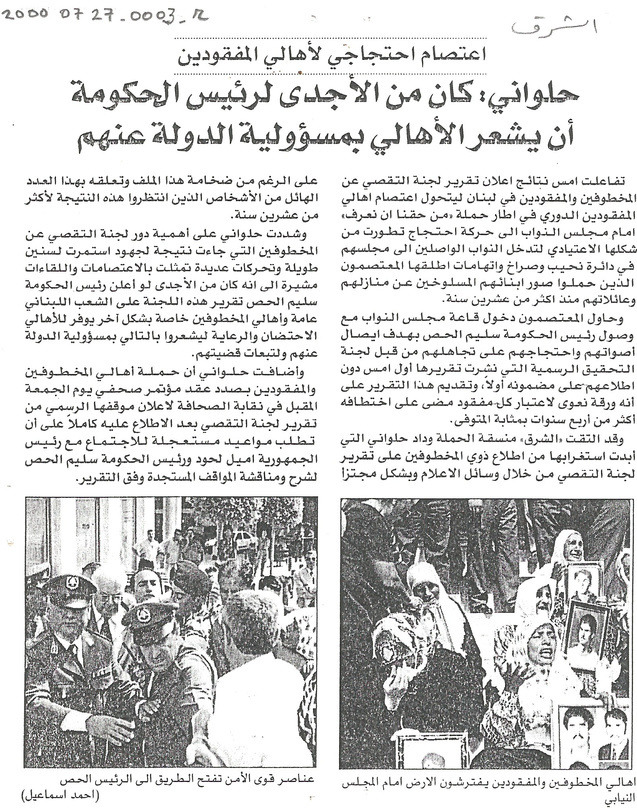 حلواني: كان من الاجدى لرئيس الحكومة ان يشعر الاهالي بمسؤولية الدولة عنهم، اعتصام احتجاجي لاهالي المفقودين