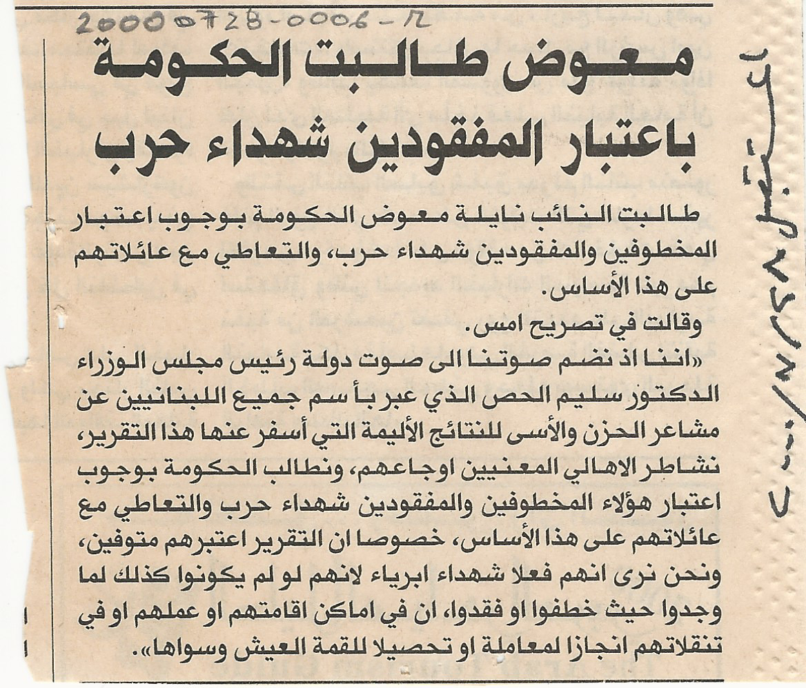 - en Mrs. Mouawad calls on the government to declare the missing as war-time martyrs.