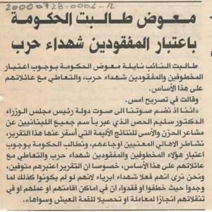 - ar معوض طالبت الحكومة باعتبار المفقودين شهداء حرب