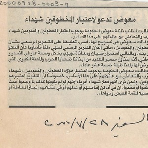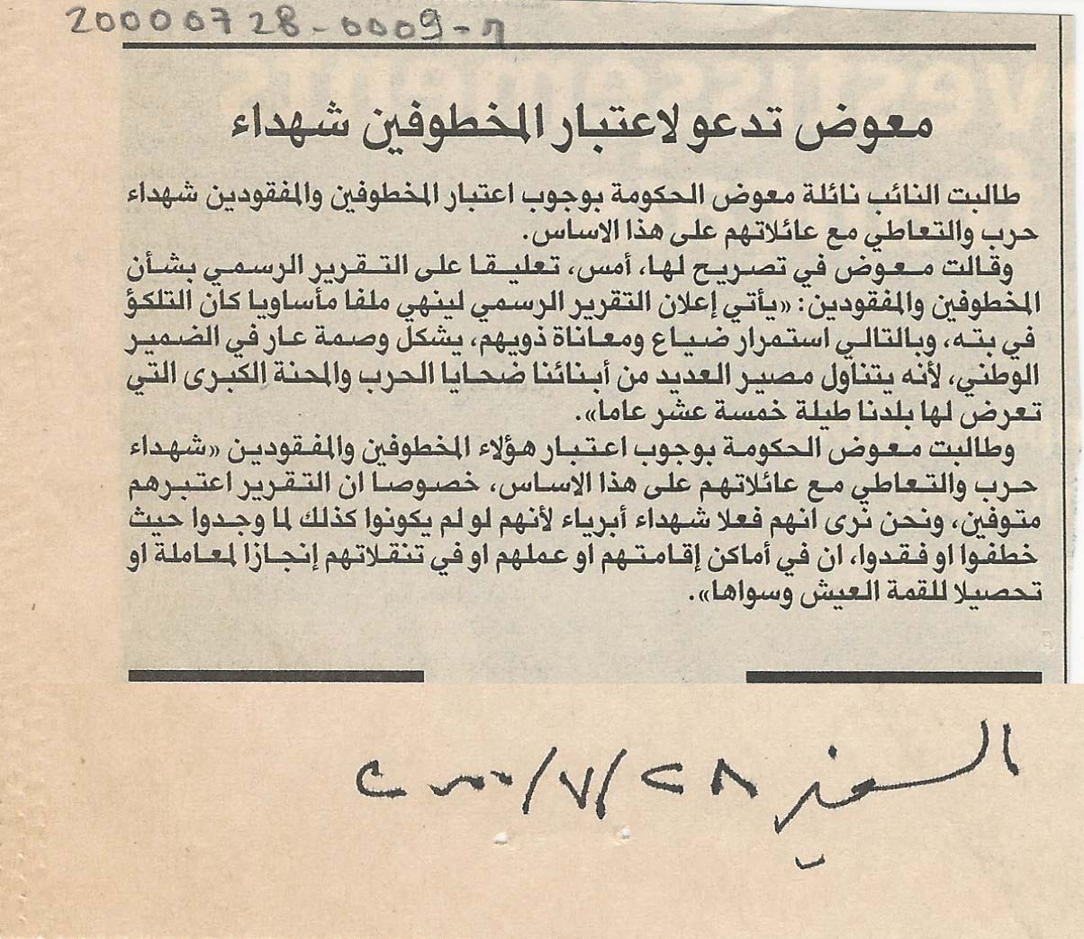 - ar معوض تدعو لاعتبارالمخطوفين شهداء