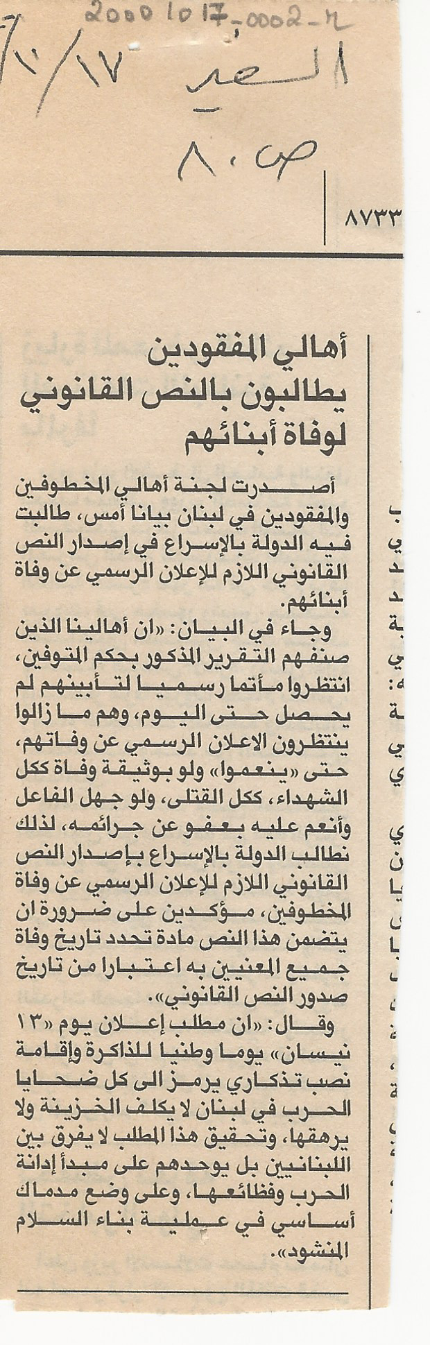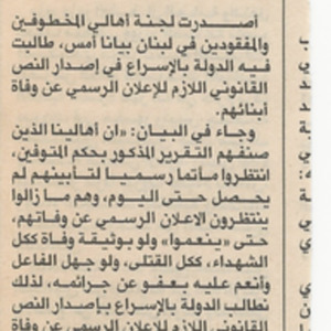 - ar اهالي المفقودين يطالبون بالنص القانوني لوفاة ابنائهم
