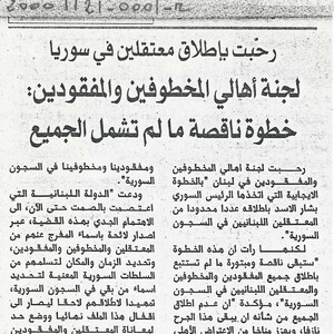 The Committee of the Families of the Kidnapped and Missing welcomed the release of the detainees in Syria: This step remains incomplete unless it includes all detainees.