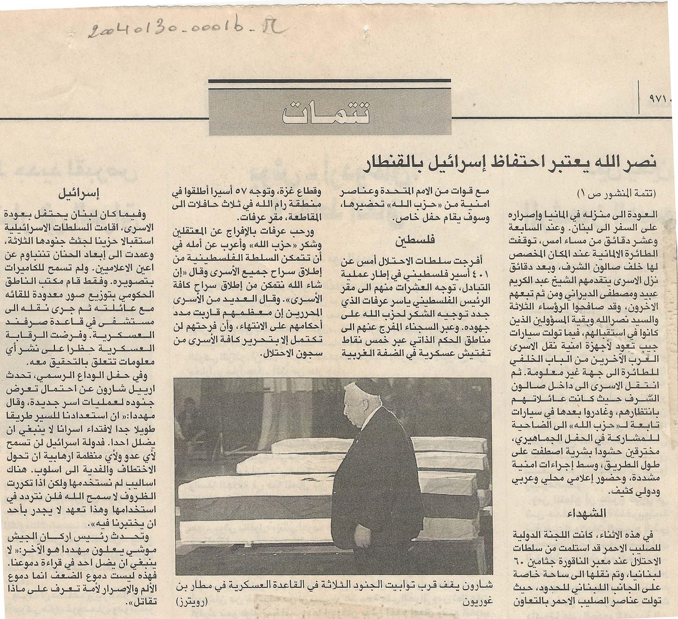 الاسرى يستقبلون ابطالاً والشهداء يودعون اليوم، نصرالله يعتبر احتفاظ اسرائيل بالقنطار حماقة ستقودها الى الندم