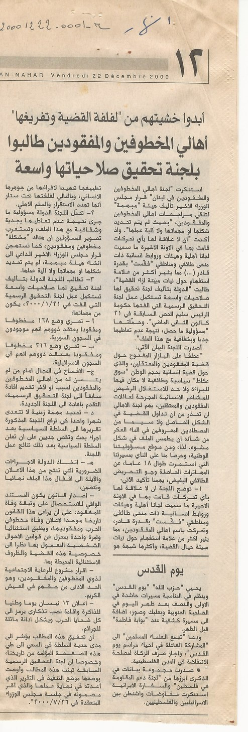 The families of the kidnapped and missing voiced their concerns over the covering and emptying of their issue of its content and demanded to form a Commission of Inquiry with wide powers.