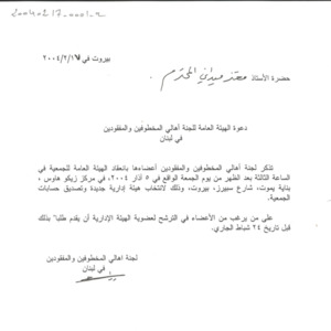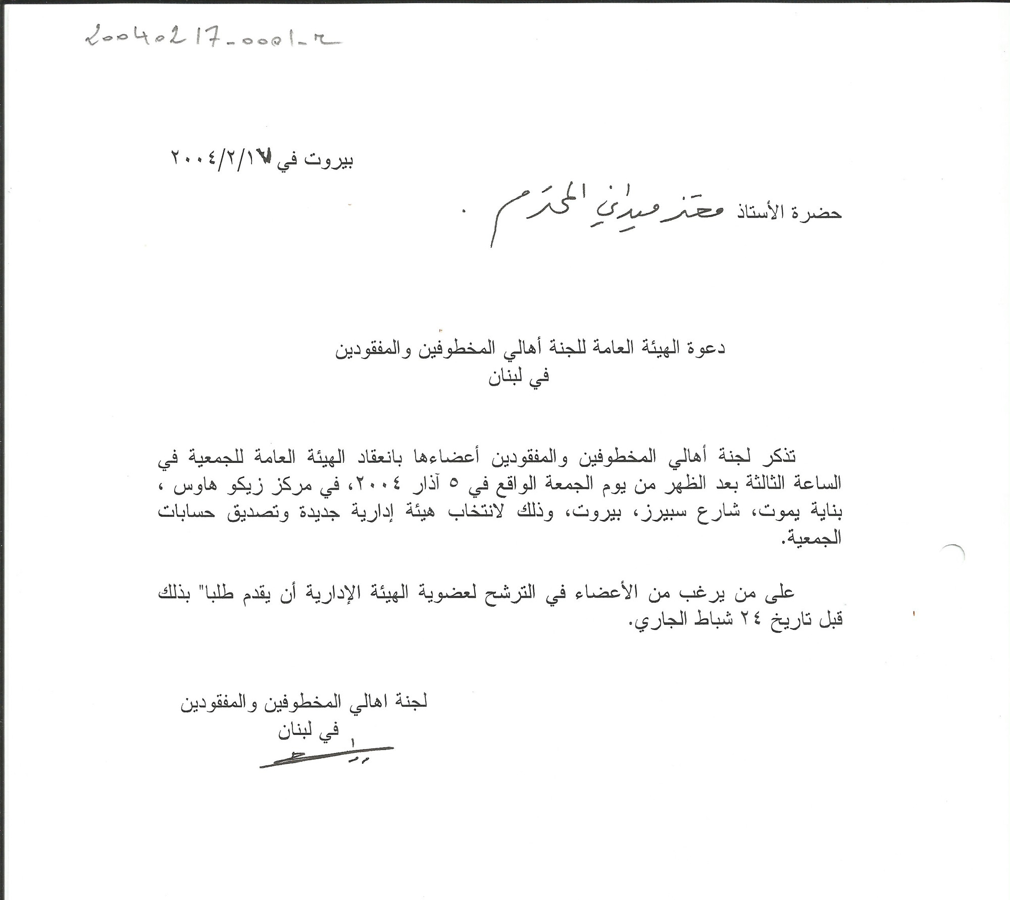 - en An invitation letter to the general committee of the Committee of the Families of the Kidnapped and Missing in Lebanon.