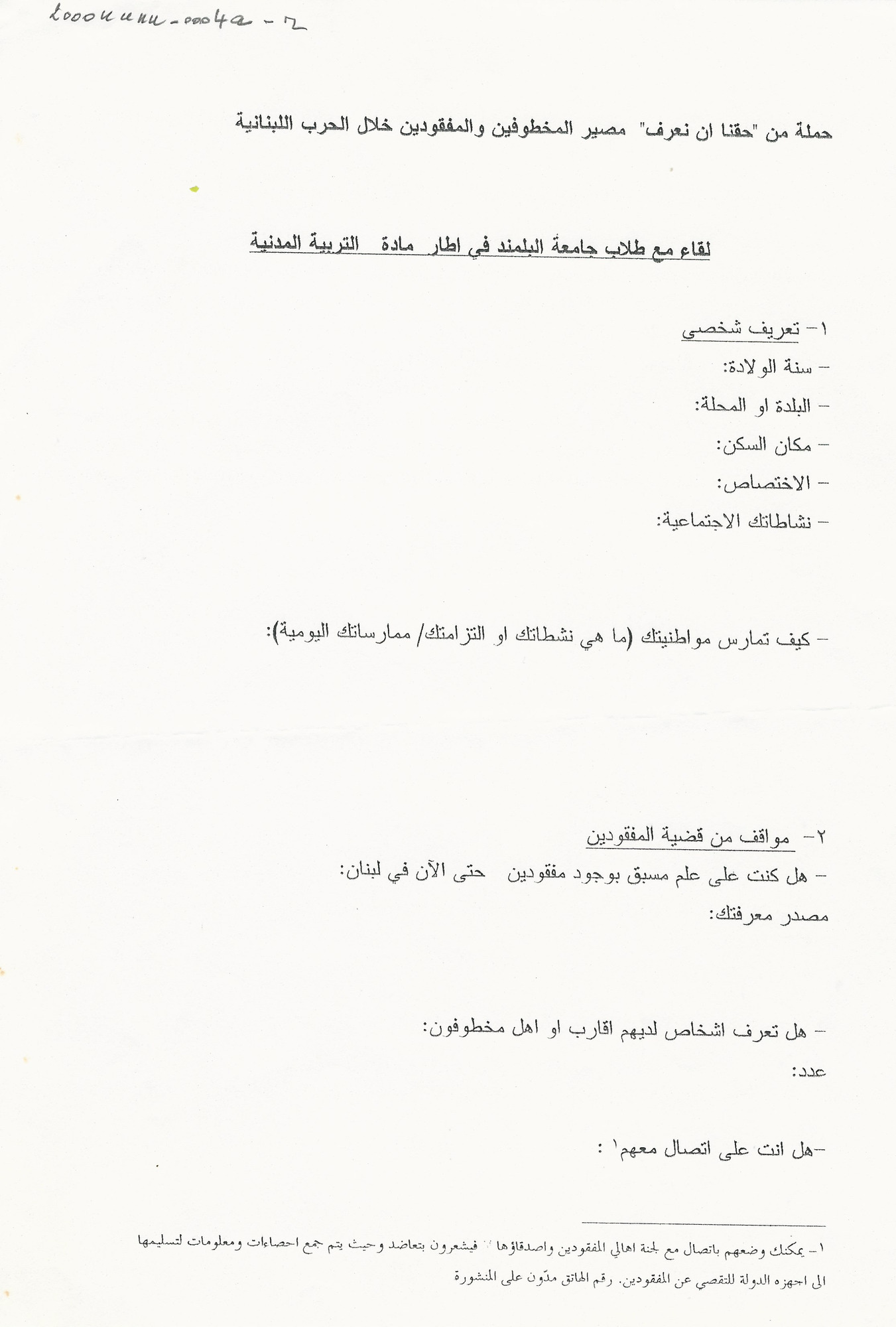 حملة من حقنا ان نعرف مصير المخطوفين والمفقودين خلال الحرب اللبنانية، لقاء مع طلاب جامعة البلمند في إطار مادة التربية المدنية