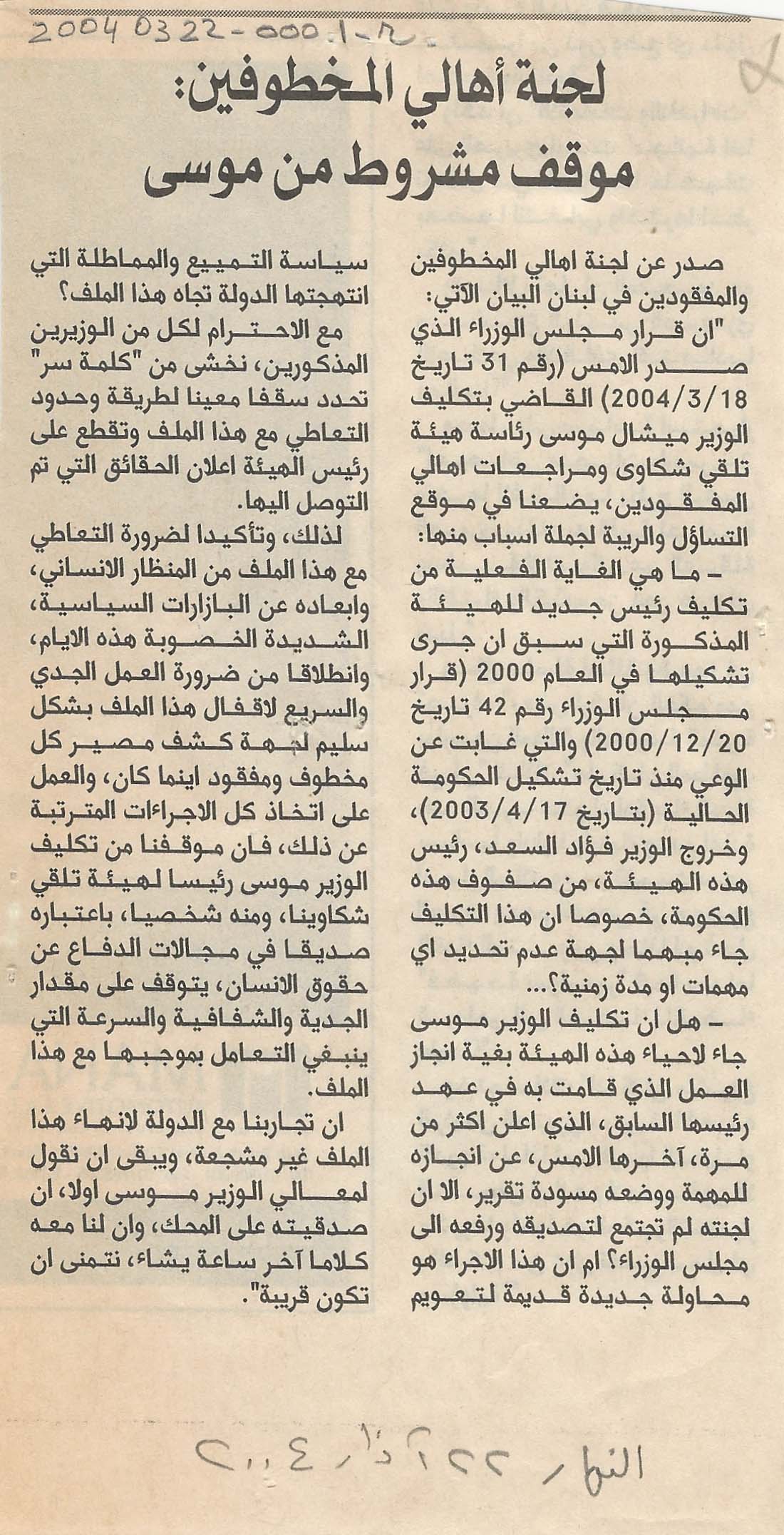 - ar لجنة اهالي المخطوفين: موقف مشروط من موسى