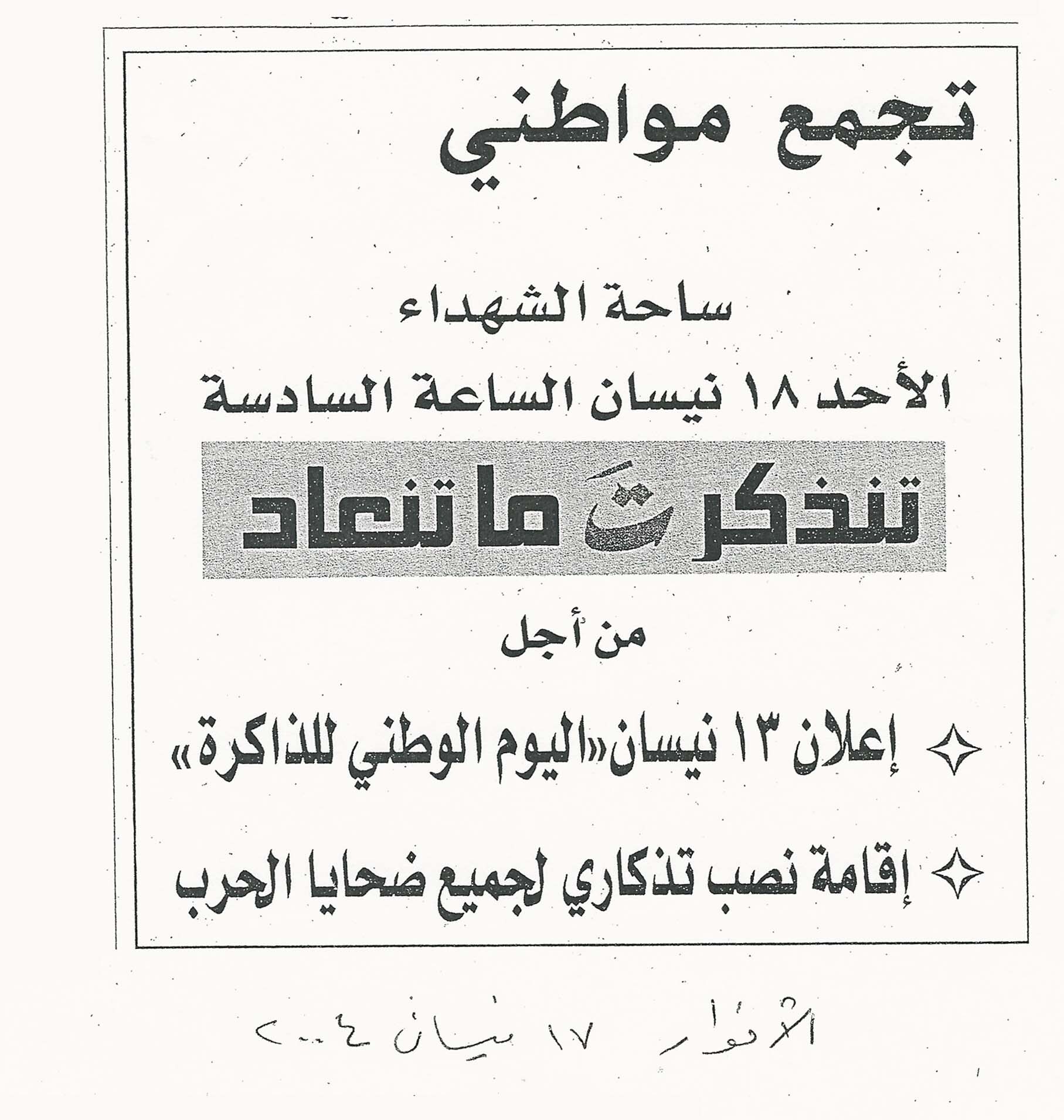 - en Citizens’ gathering, Martyrs’ Square, Sunday April 18 at 6:00 pm.