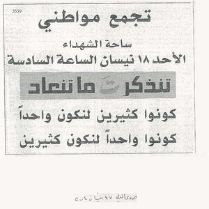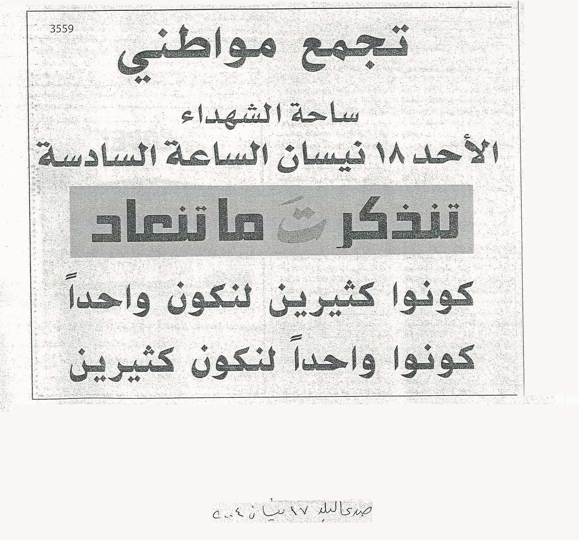 - en Citizens’ gathering, Martyrs’ Square, Sunday April 18 at 6:00 pm.