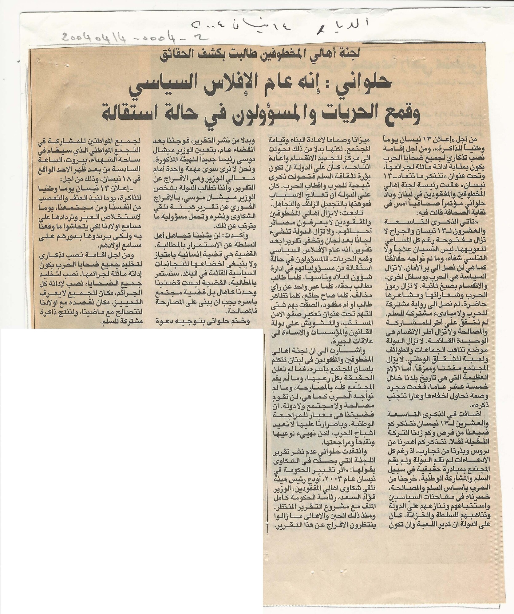 لجنة اهالي المخطوفين طالبت بكشف الحقائق، حلواني: انه عام الافلاس السياسي وقمع الحريات والمسؤولون في حالة استقالة