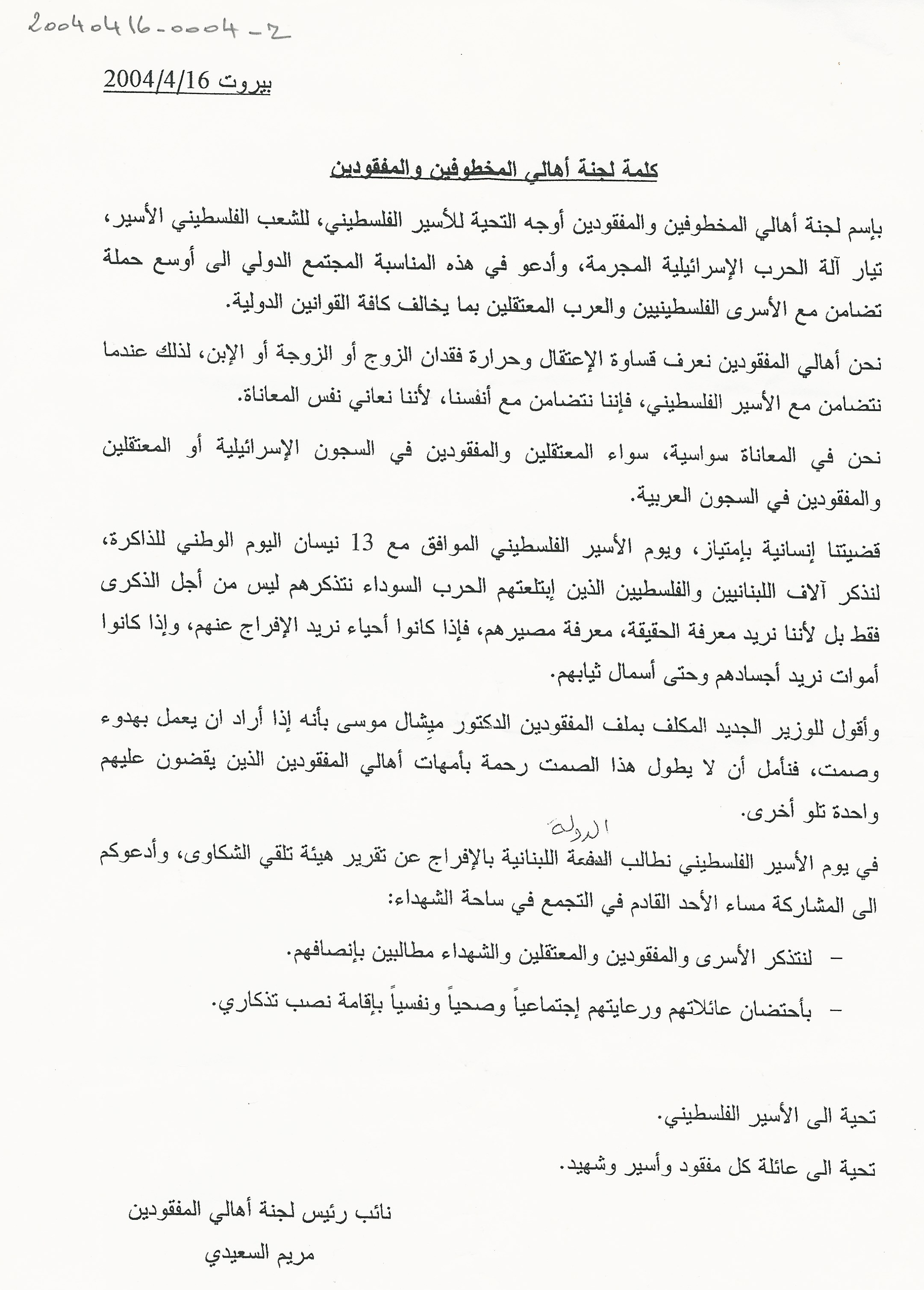 - ar كلمة لجنة الاهالي بمناسبة 13 نيسان ويوم الاسير الفلسطيني