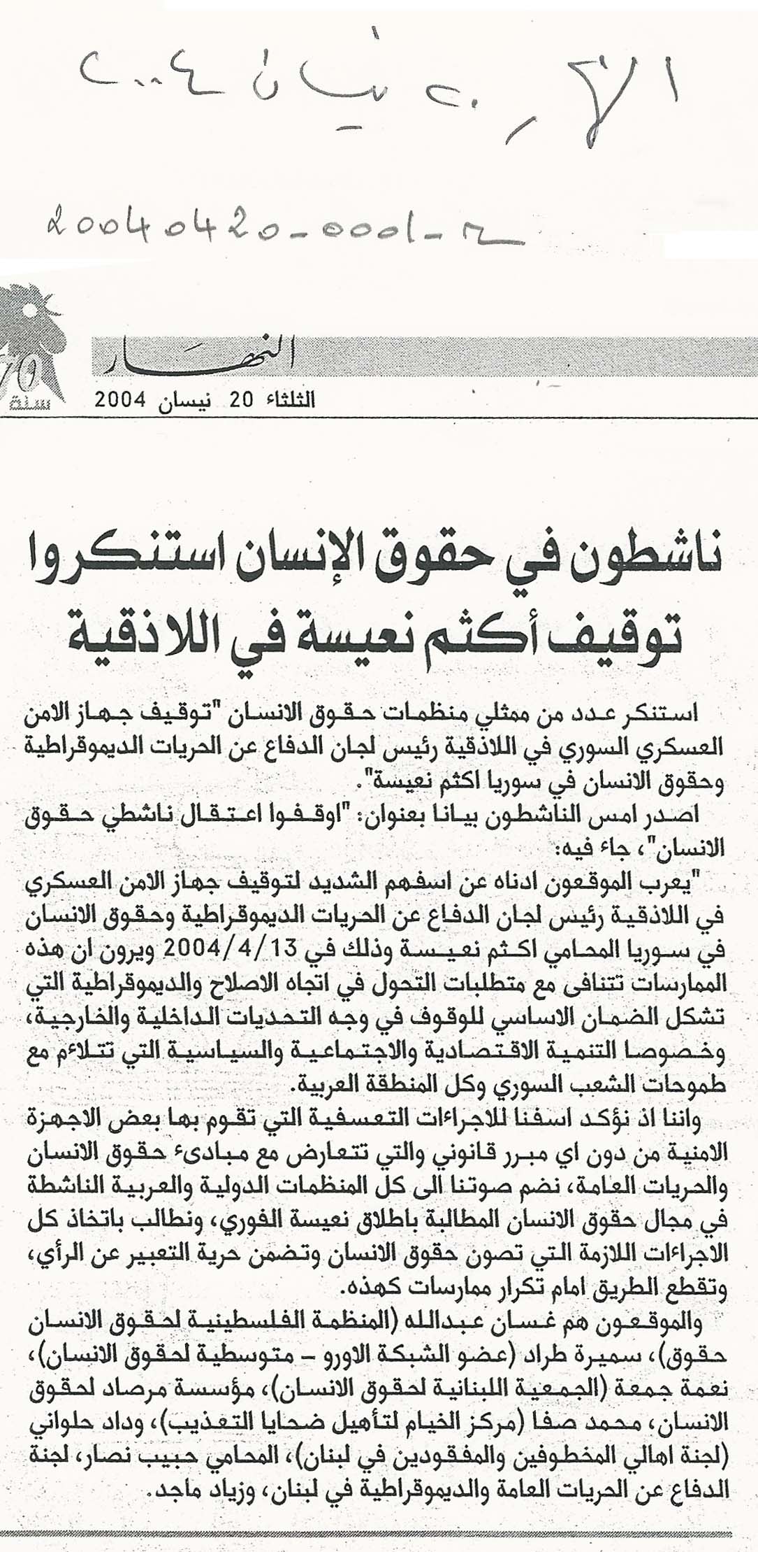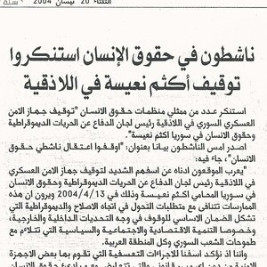- en Human rights activists denounce the arrest of Aktham Nouayse in Latakia.