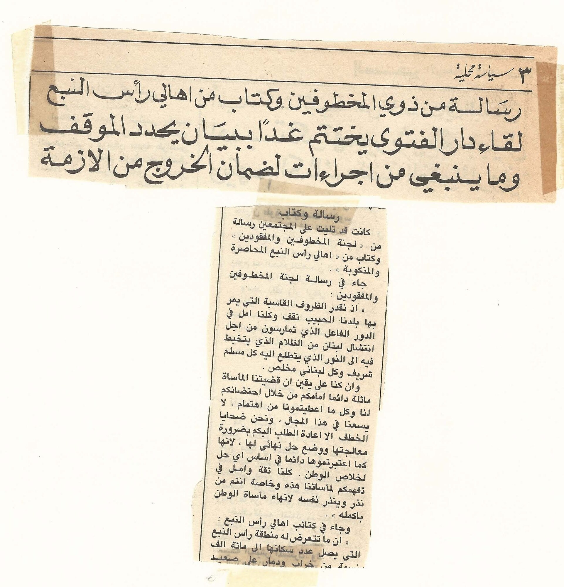 A letter from the families of the kidnapped and another from the families of Ras al-Nabaa.