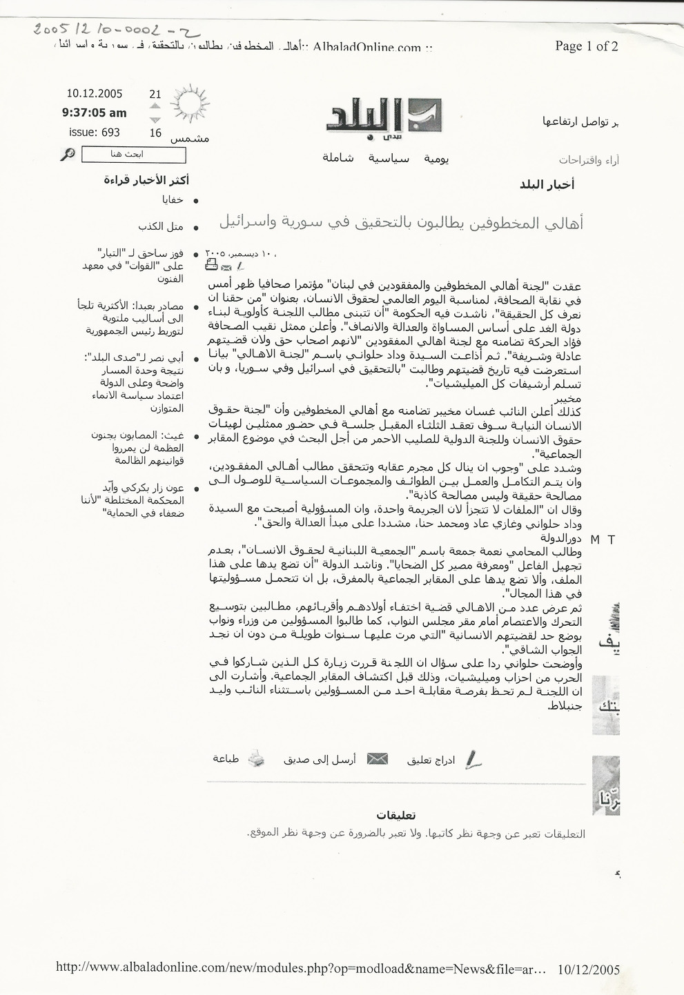 - en The Committee of the Families of the Kidnapped requests that investigations be carried out in Israel and Syria.
