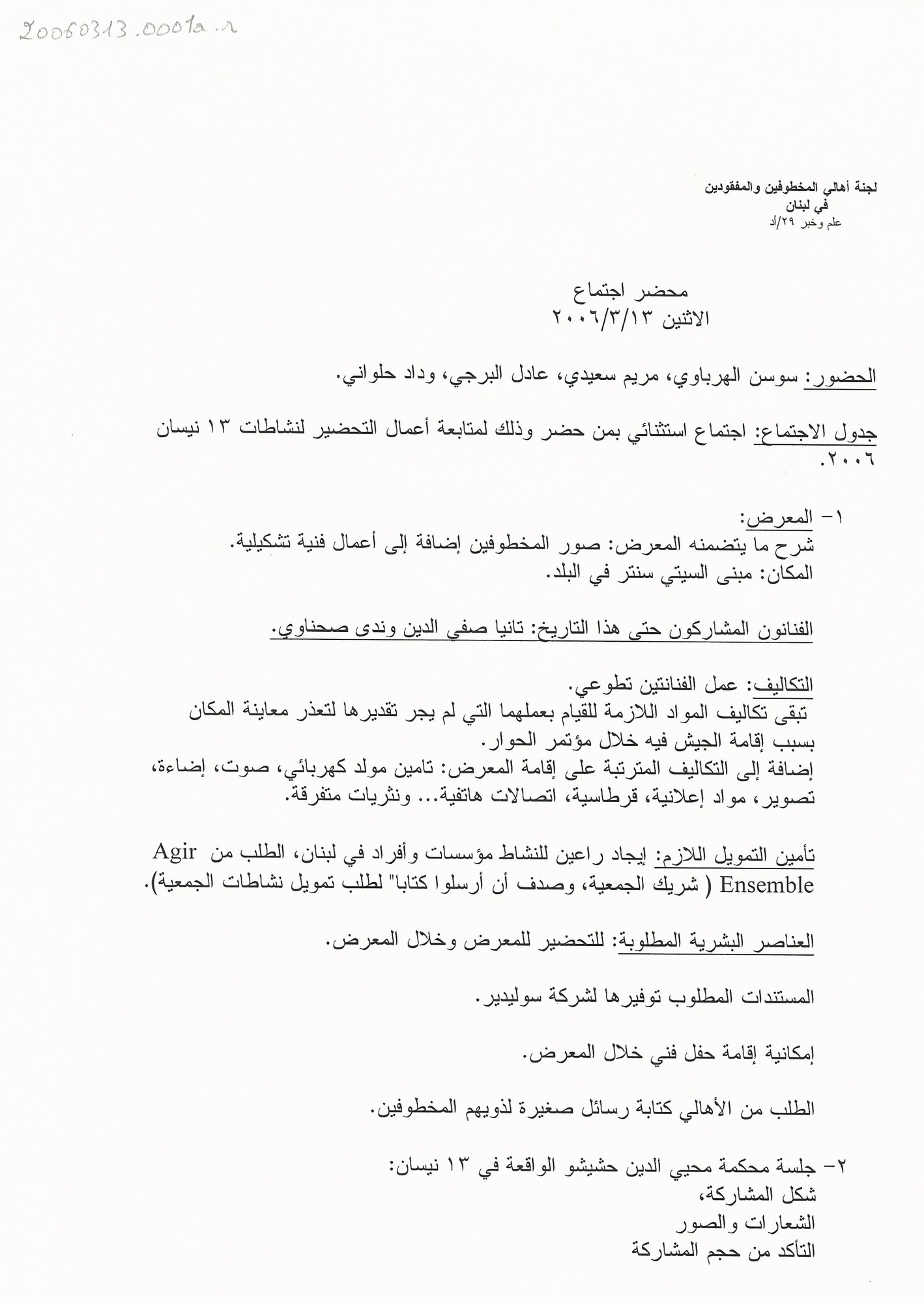 محضر اجتماع الهيئة الادارية للجنة الاهالي، الاثنين، 13، 3، 2006