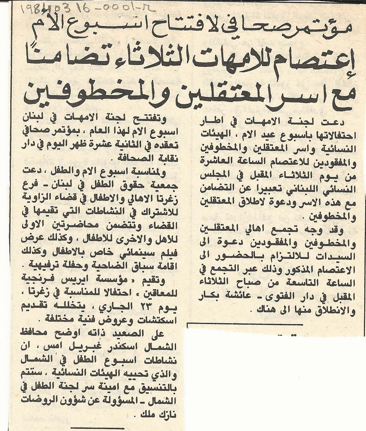 مؤتمر صحافي لافتتاح عيد الأم، اعتصام للأمهات الثلاثاء تضامنا مع اسر المعتقلين والمخطوفين
