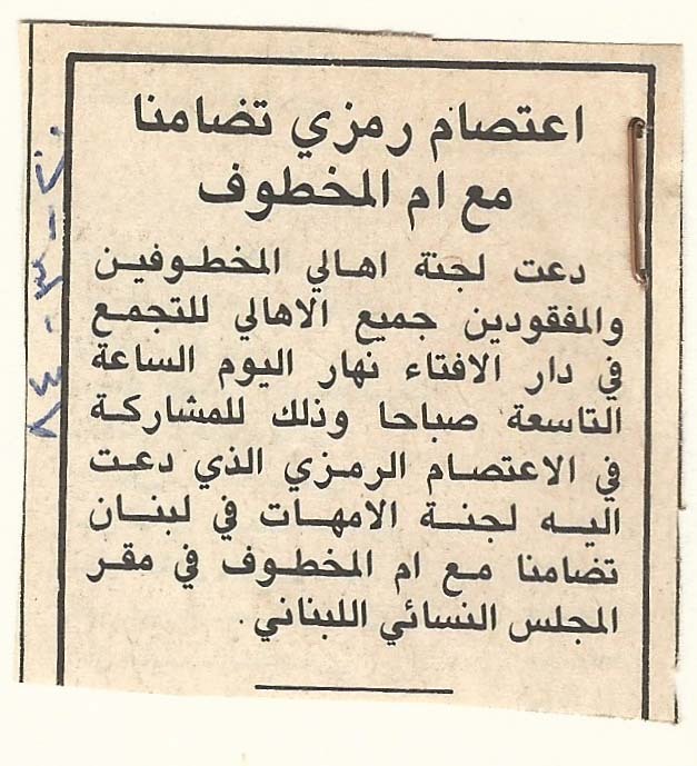 - en A symbolic sit-in was held in solidarity with the mother of a kidnapped.