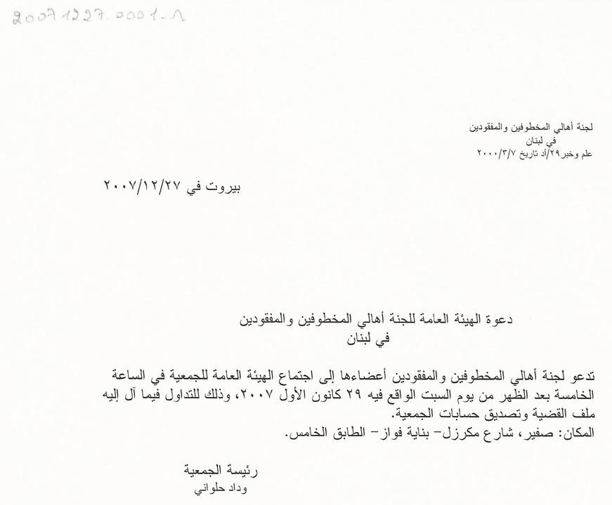 - en A call for the general board of the Committee of the Families of the Kidnapped and Missing in Lebanon