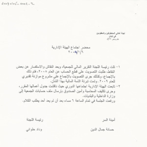 - ar محضر اجتماع الهيئة الادارية للجنة الاهالي، الثلاثاء، 6، 1، 2009
