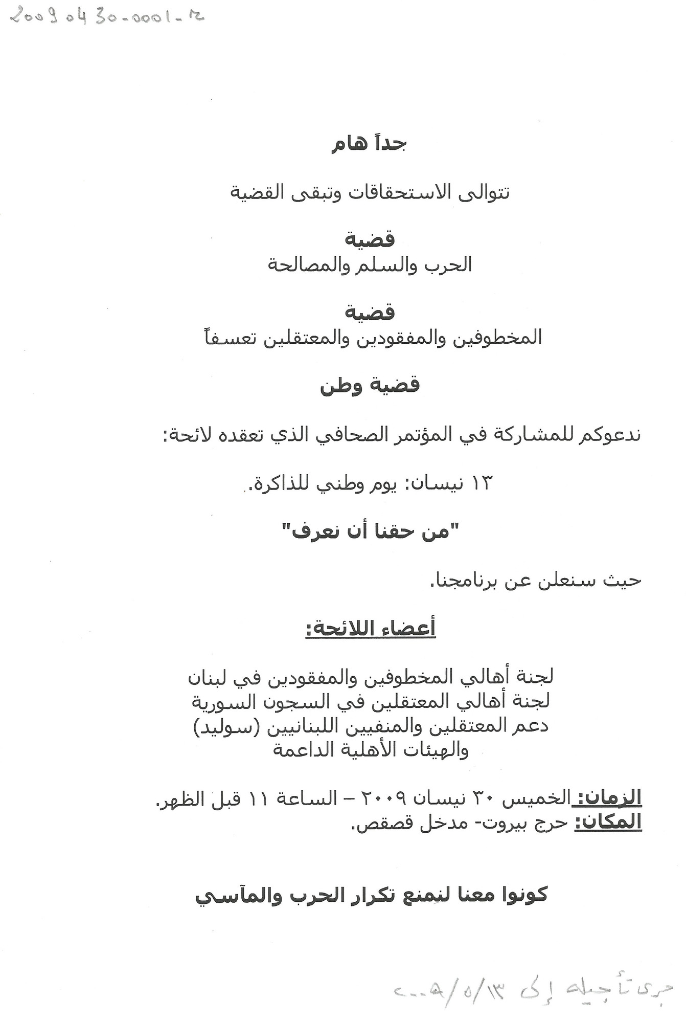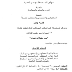 دعوة الى مؤتمر صحافي للجنة اهالي المخطوفين في حرج بيروت
