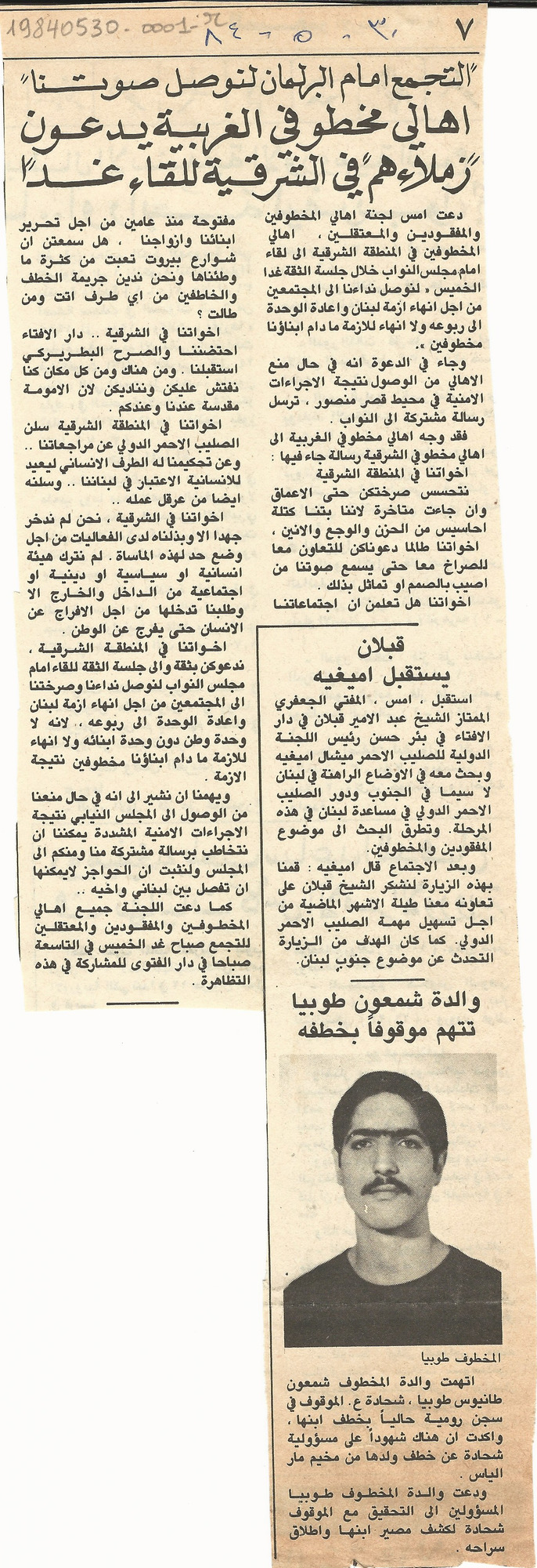 The families of the kidnapped from West Beirut call their counterparts from East Beirut for a meeting tomorrow: Let’s gather in front of the Parliament to raise our voice.