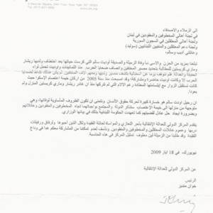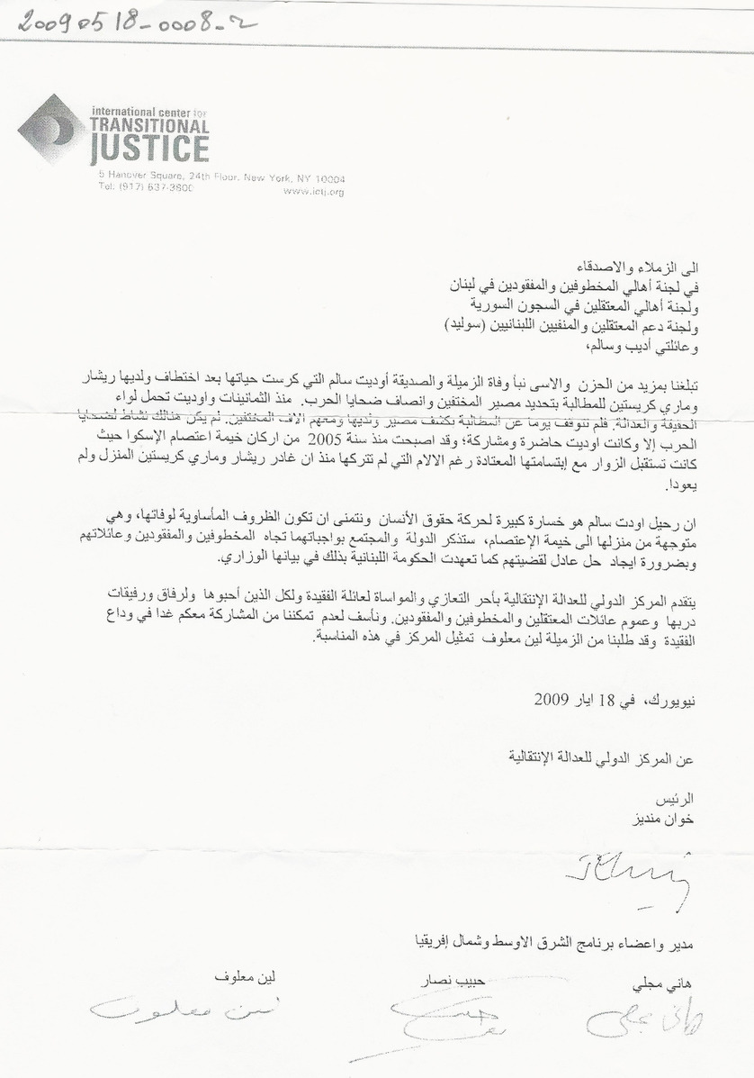 - ar رسالة تعزية من المركز الدولي للعدالة الانتقالية بوفاة اوديت سالم
