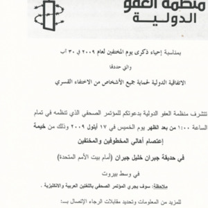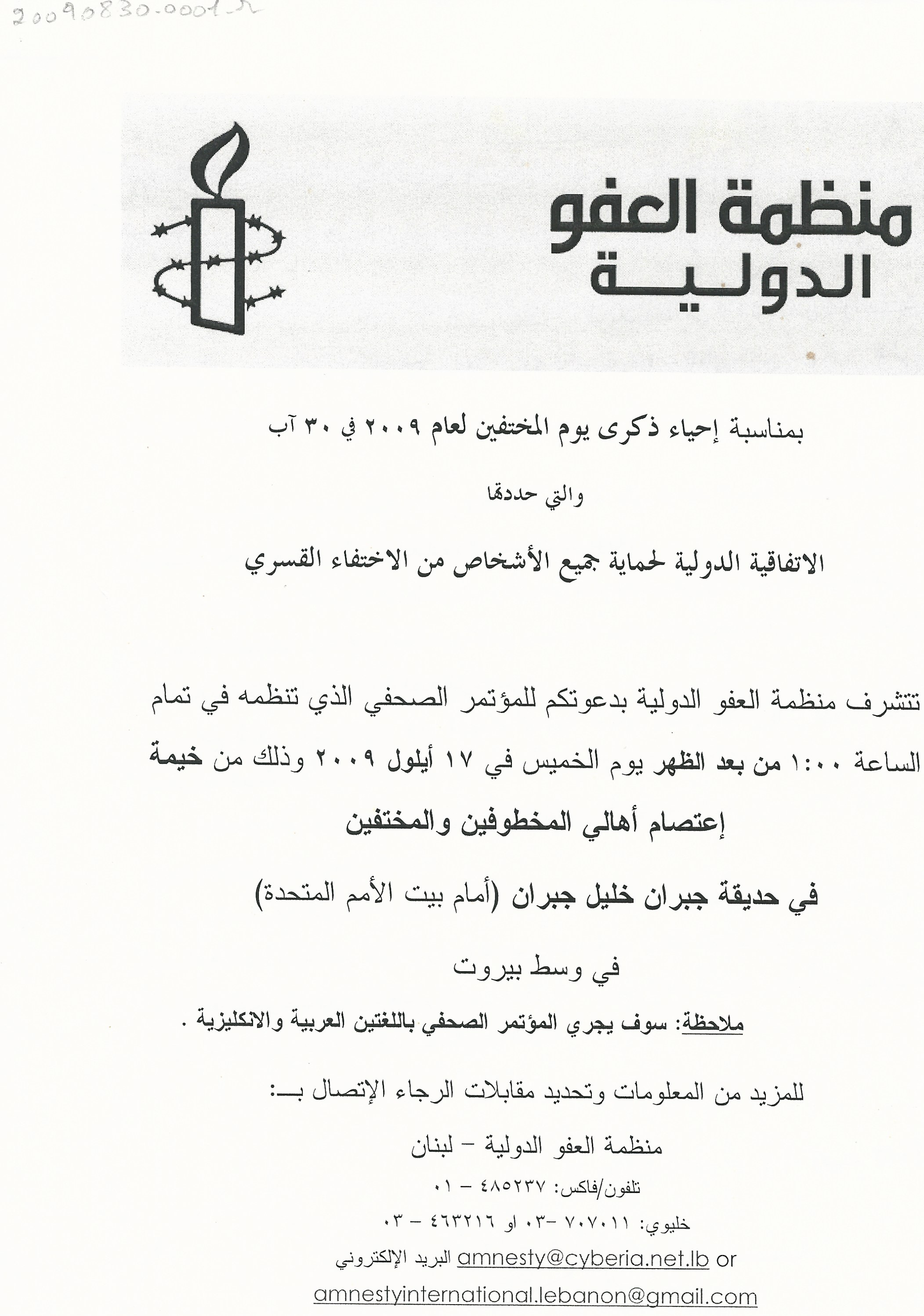 دعوة الى مؤتمر صحافي تعقده منظمة العفو الدولية، بمناسبة احياء ذكرى يوم المختفين