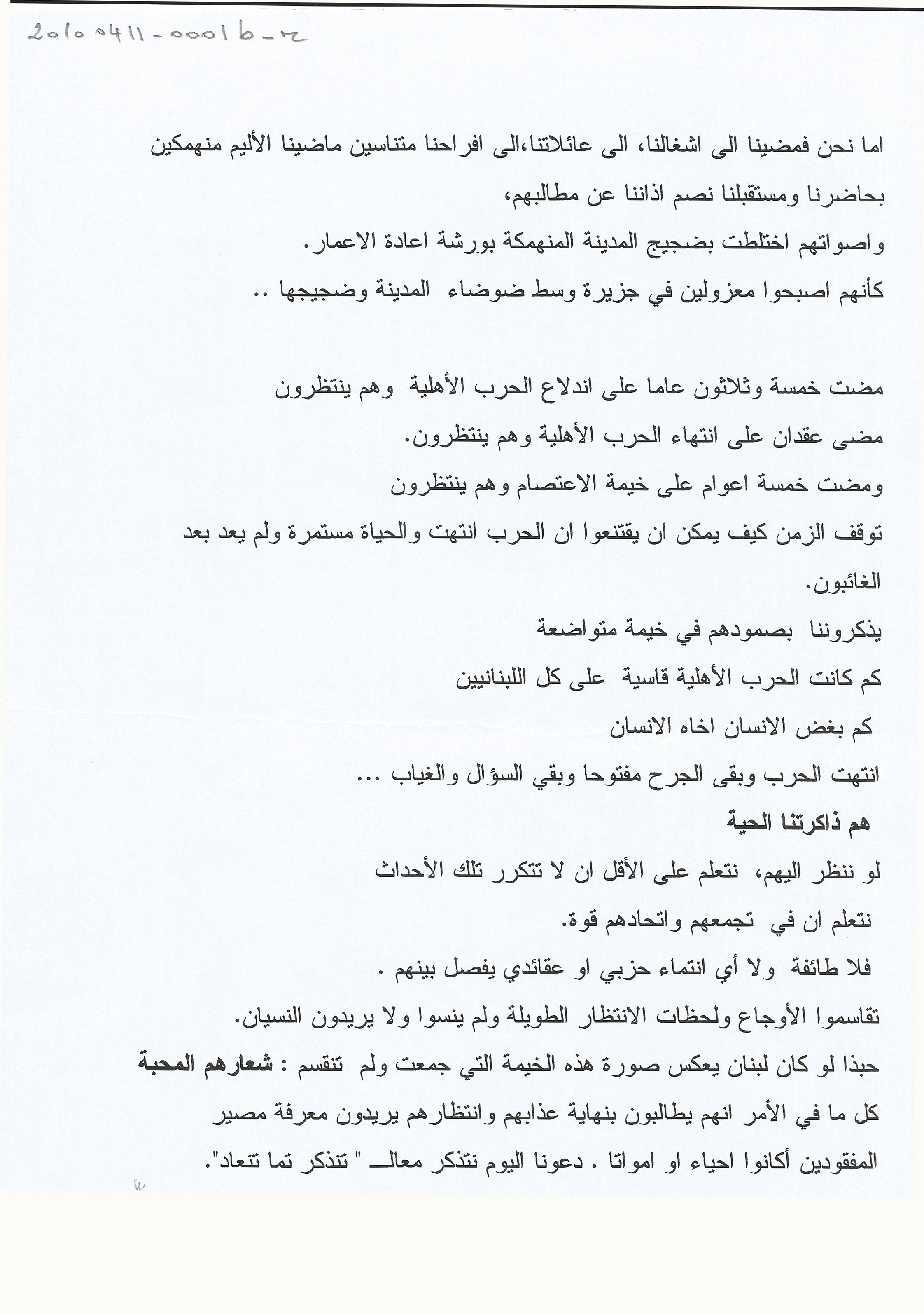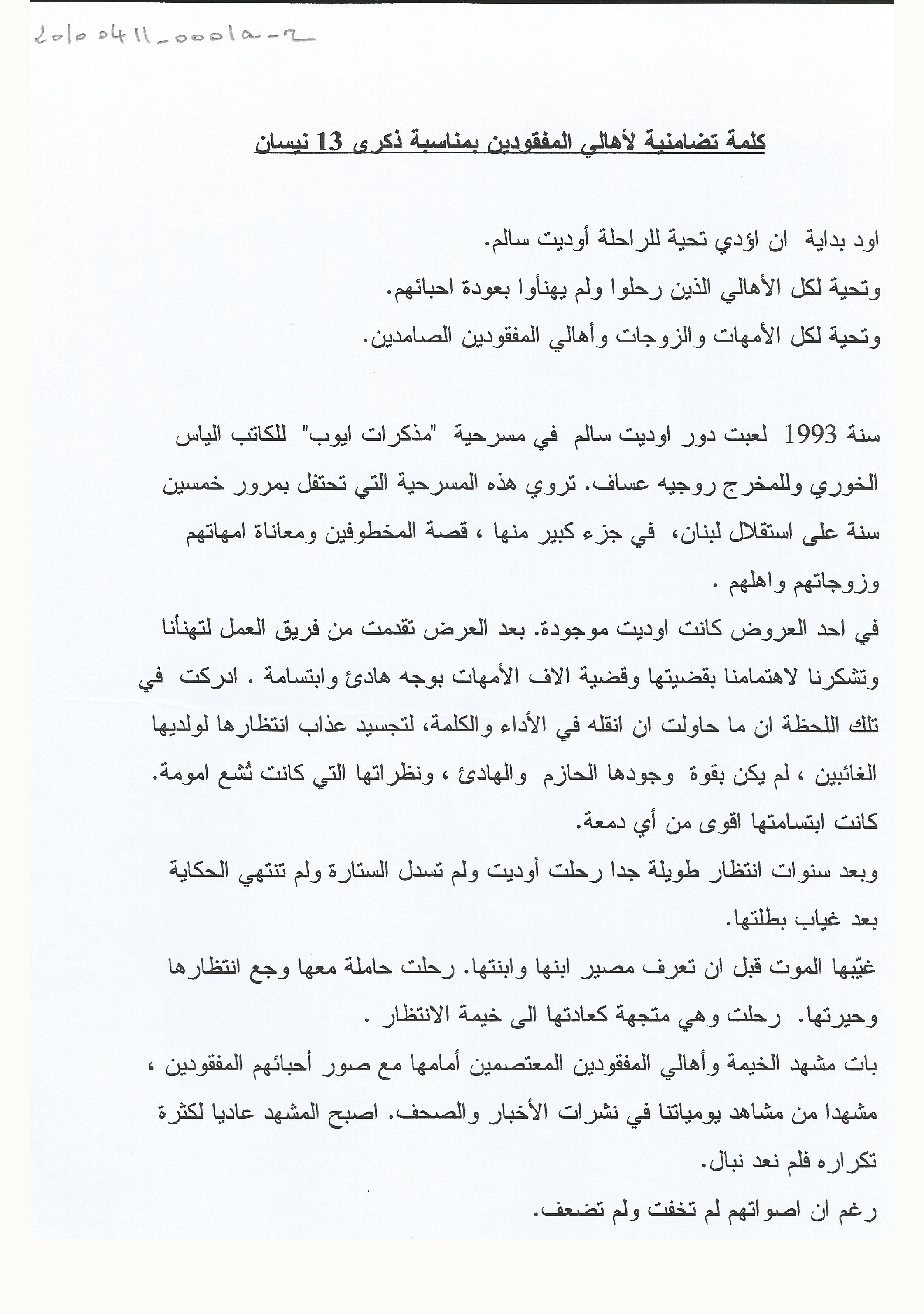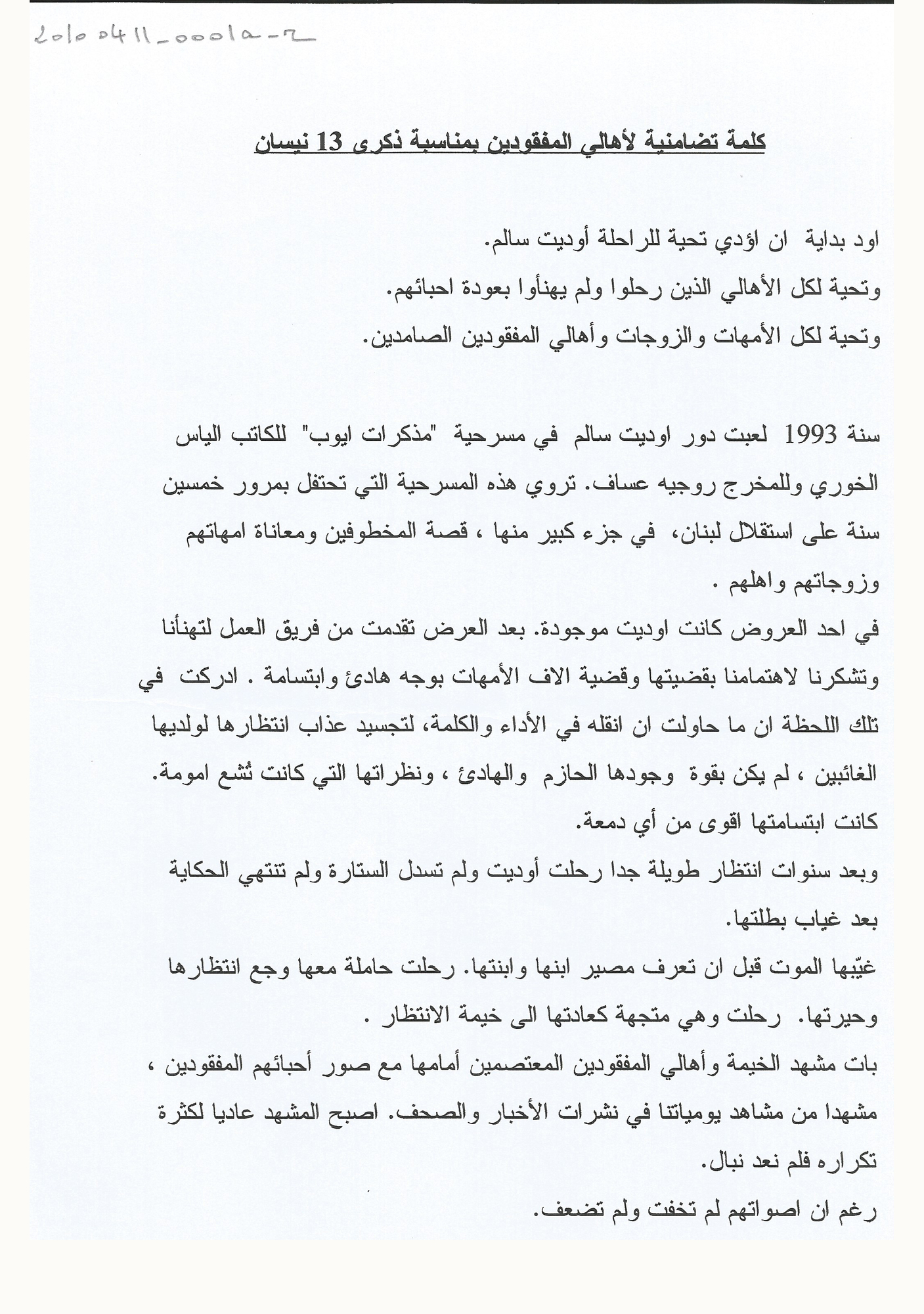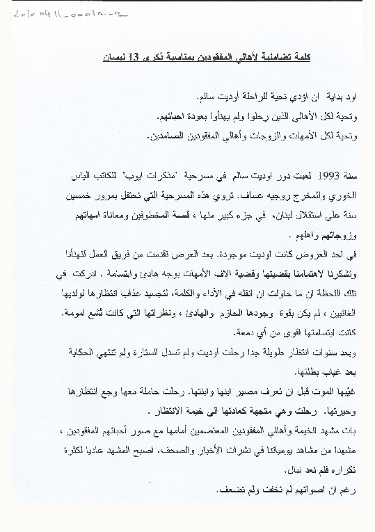 كلمة جوليا قصار بمناسبة 13 نيسان 2010 الذكرى الـ 35 للحرب في لبنان